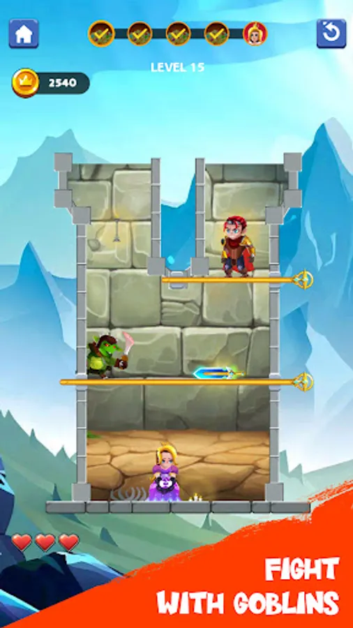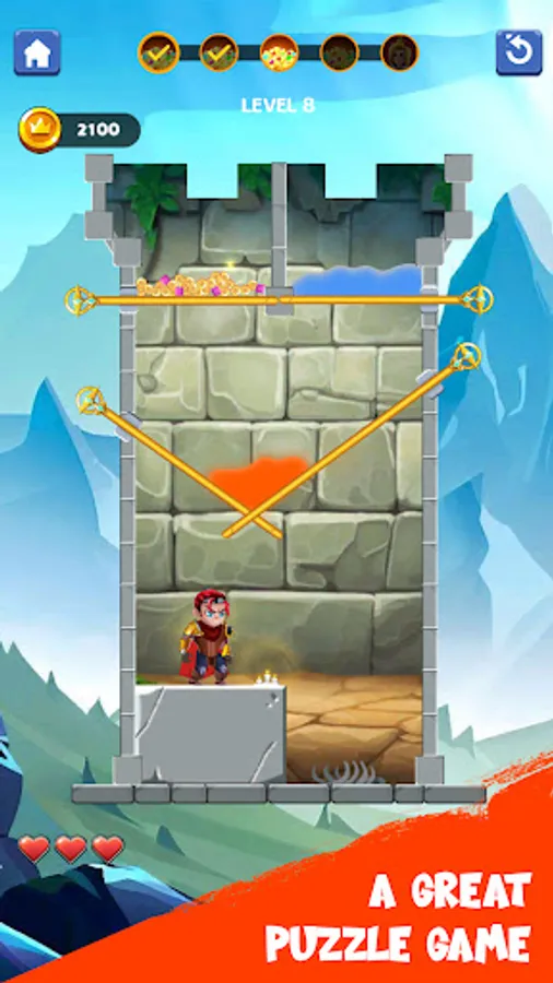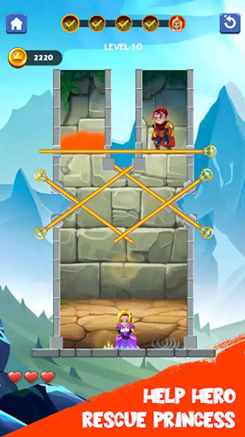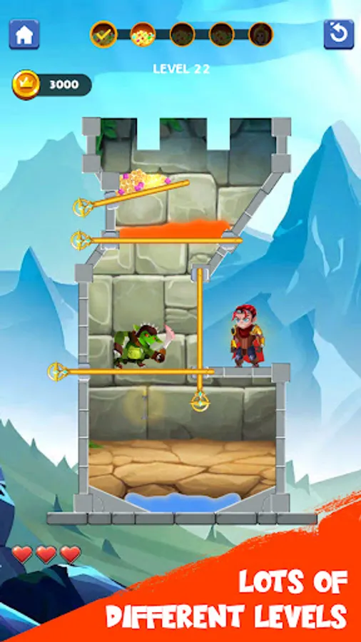 Various missions and levels await you in our hero puzzle. Kill goblins, pass lava, search for treasure, let’s pull pins to save the king or become a king, save the princess. Show your wits by solving hundreds of challenging brain in pin puzzles.