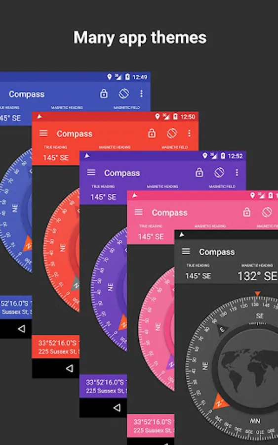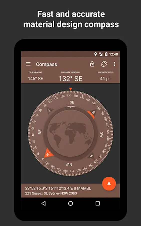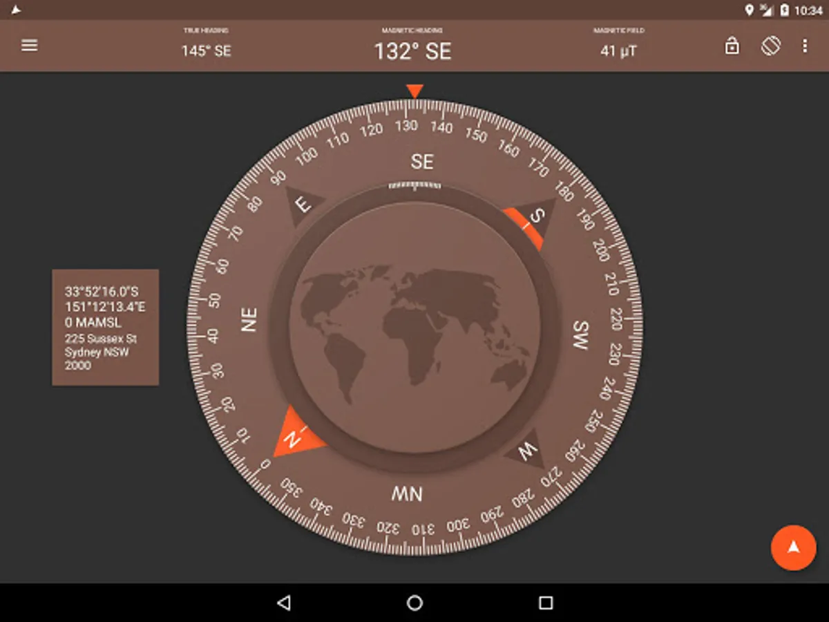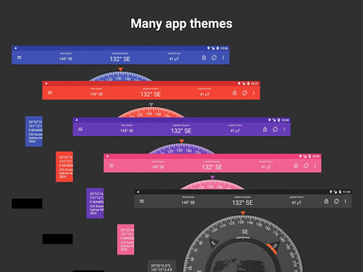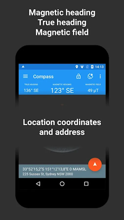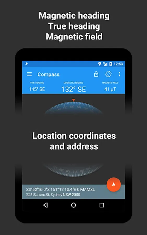 • Displays magnetic heading, true heading, magnetic field, location and address.