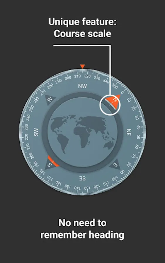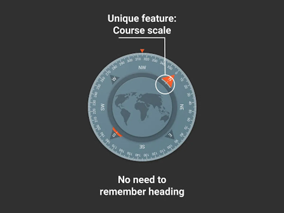 • Unique feature "course scale". Enables you to mark your preferred azimuth and determine your return direction.