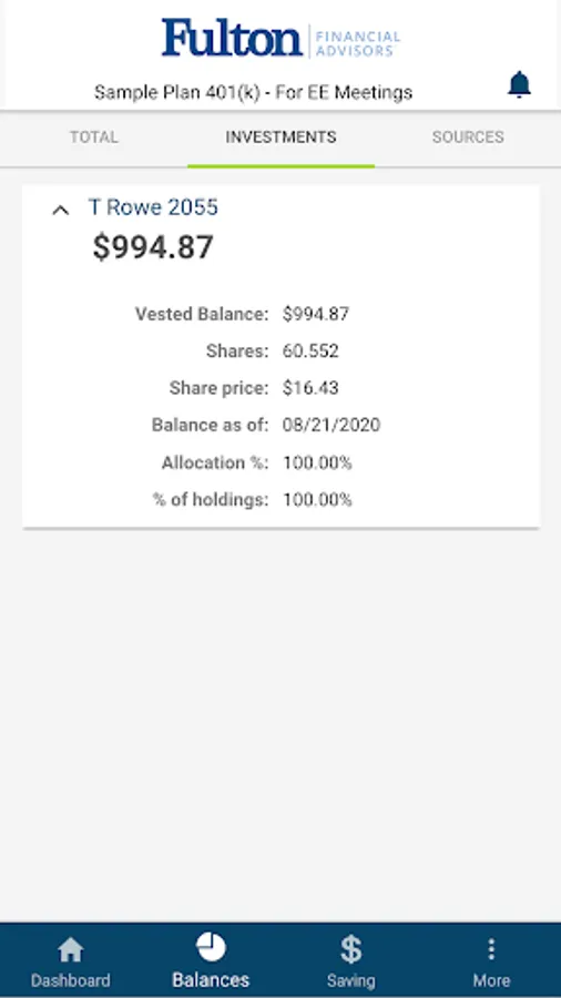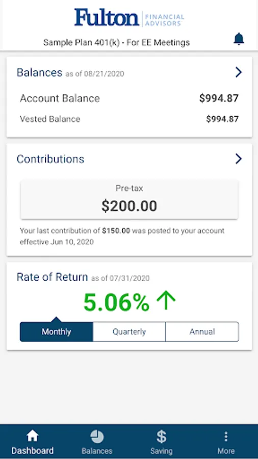 Access your retirement account from anywhere with Fulton Financial Advisors’ mobile app. With the mobile app you can check recent transactions, balances, and current investment elections. Let our mobile app help you reach your retirement goals!