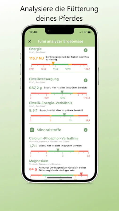 fumi helps you to find out the individual nutritional needs of your horse. With the fumi Analyzer you can see at a glance whether your horse is getting all the nutrients it needs. In the event of oversupply or deficits, you can use the analysis to put together the optimal ration for your horse.