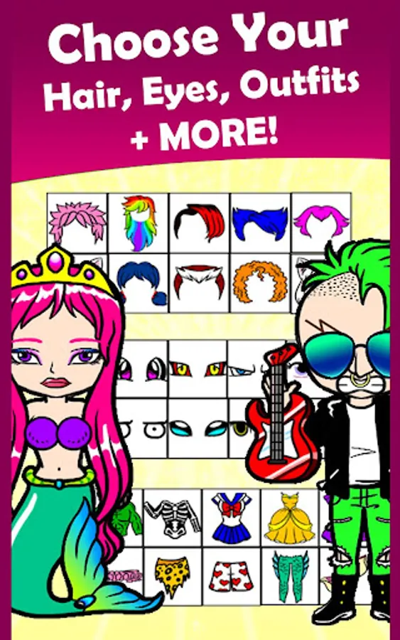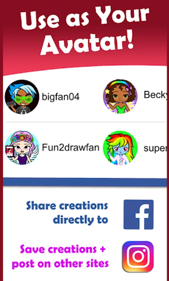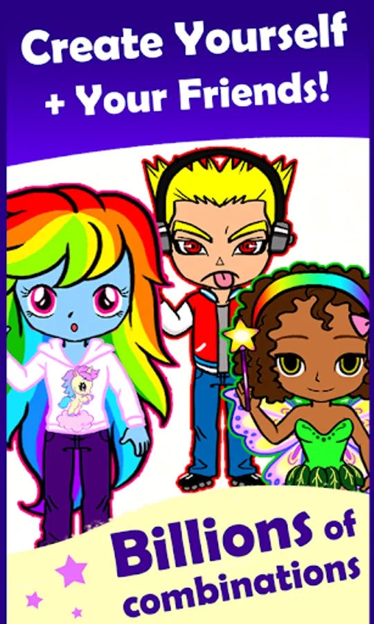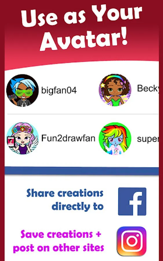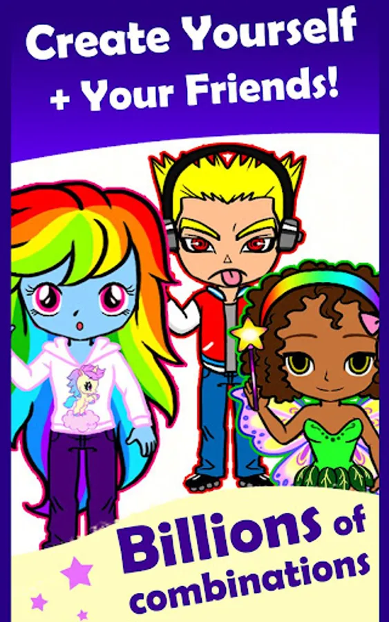 Have fun letting your imagination run wild! With hundreds of items and billions of possible combinations, you'll spend hours with Fun2Create: Design Yourself! Try creating yourself, your friends and family, or your favorite characters! You can then share your creations directly to Facebook inside the game, or save them to your mobile device and share them to your other favorite social media sites, like Instagram. You can even use them as your avatar pics!