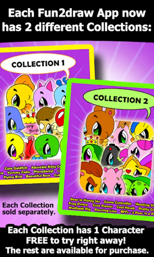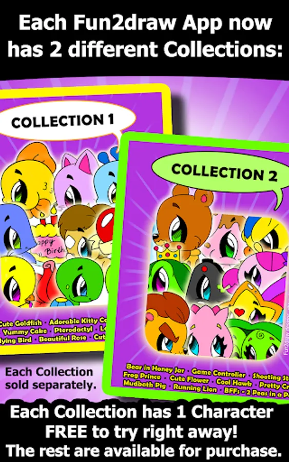 Collection 1 and Collection 2 each come with a free character, ready for you to draw and color right away. Plus, in each Collection, a set of 9 additional brilliant cartoon characters are available for you to purchase to complete that Collection! Please note that each Collection is sold separately. You must have internet connection for in-app purchases.