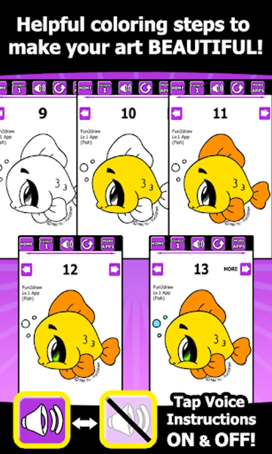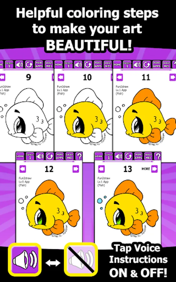 Fun2draw, Fun2draw apps, their logos, drawings, designs, characters, characters' distinctive likeness, and audio belong to Mei Yu, and are protected by Copyright and Trademark Laws. Fun2draw apps are for personal, home use only. Any commercial use is strictly prohibited. Please report any copyright or trademark violations to Mei Yu through the email address above.