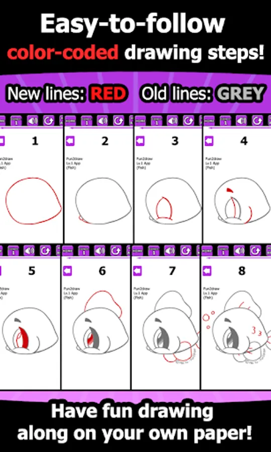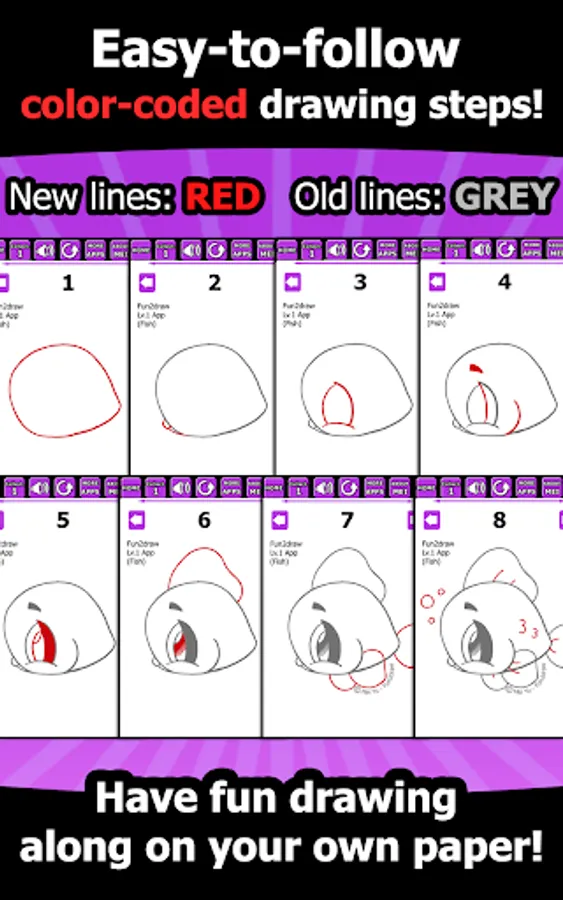 Now you can easily follow along with Fun2draw Lv1 on your phone or tablet, using your own drawing paper at your own pace. Easy to use for all ages!