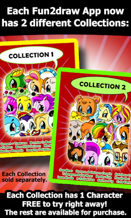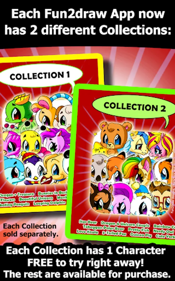 Collection 1 and Collection 2 each come with a free character, ready for you to draw and color right away. Plus, in each Collection, a set of 9 additional brilliant cartoon characters are available for you to purchase to complete that Collection! Please note that each Collection is sold separately. You must have internet connection for in-app purchases.
