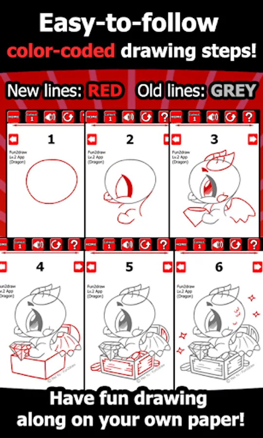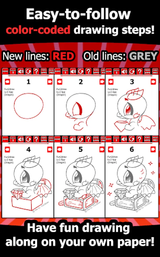 Now you can easily follow along with Fun2draw Lv2 on your phone or tablet, using your own drawing paper at your own pace. Easy to use for all ages!