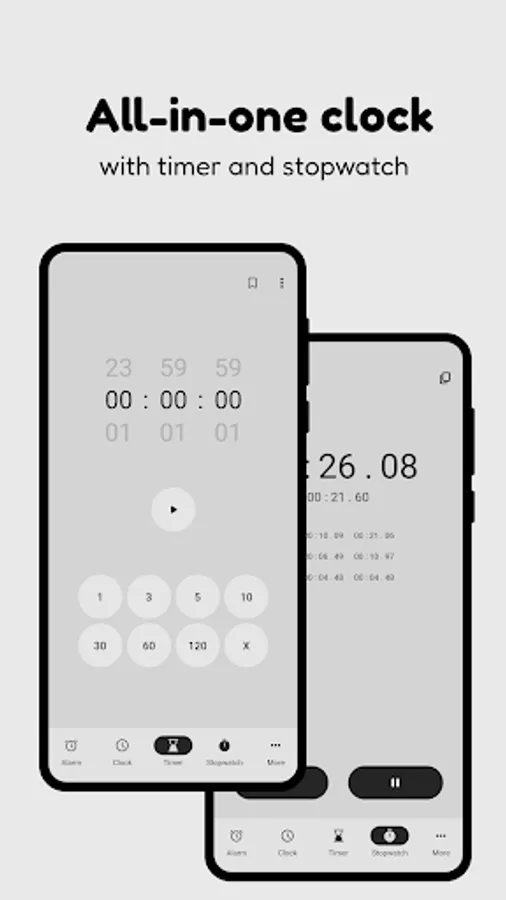 Features include headphone alarm mode to avoid disturbing others, stopwatch and timer as essential clock functions, backup/restore when changing devices, and Android reading out the time while the alarm is ringing, allowing you to know the time even with your eyes closed.