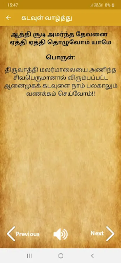 The Aathichudi application provides Aathichudi with audio,English translation and meanings which will be easy to understand.