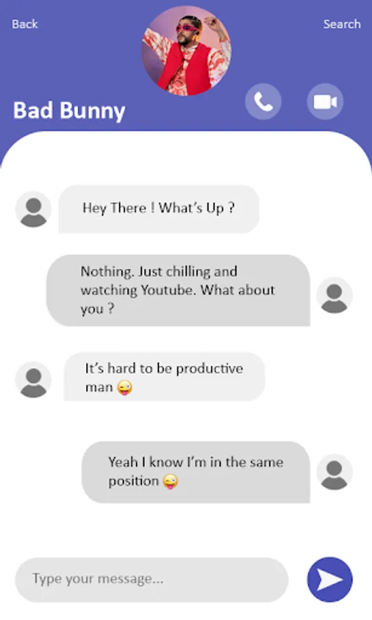 With this application you will be able to simulate a fake chat with Bad Bunny to play a joke on your friends and make them believe that you have contact with the singer Bad Bunny!