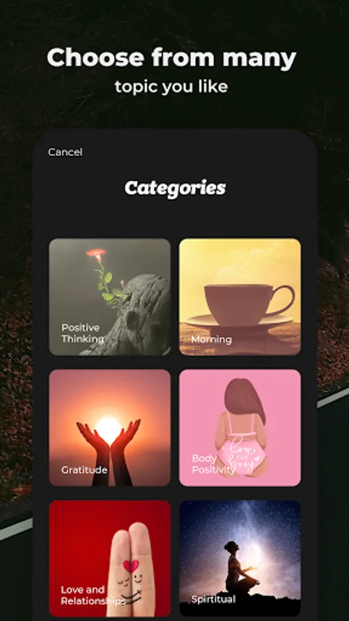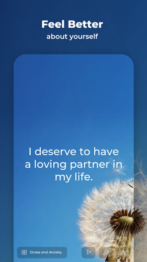 Play Mode: By clicking 'play' button, the app switches into full screen mode and auto-play the chosen affirmation category in a loop.