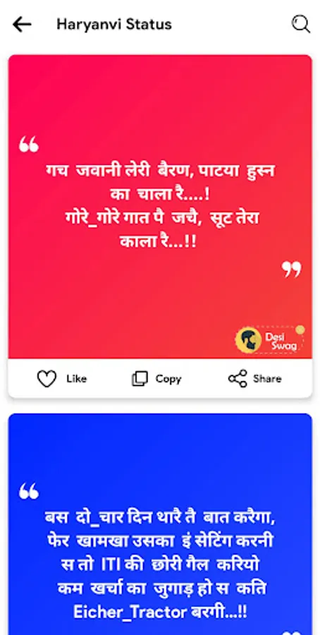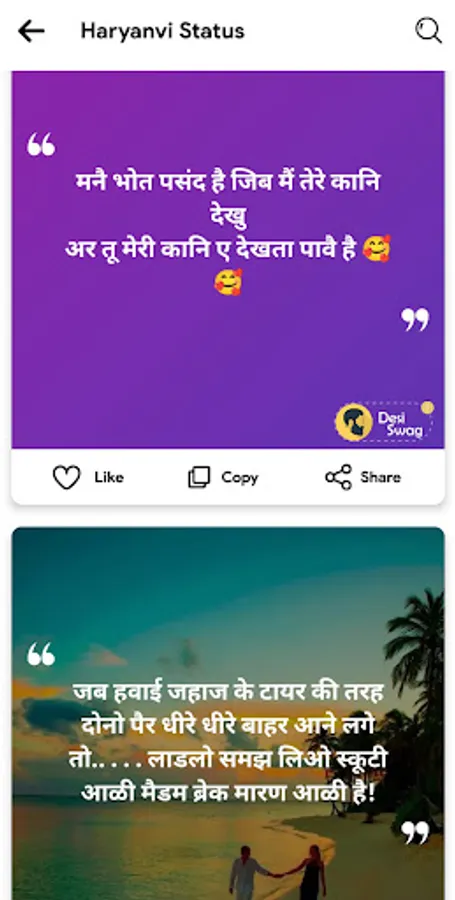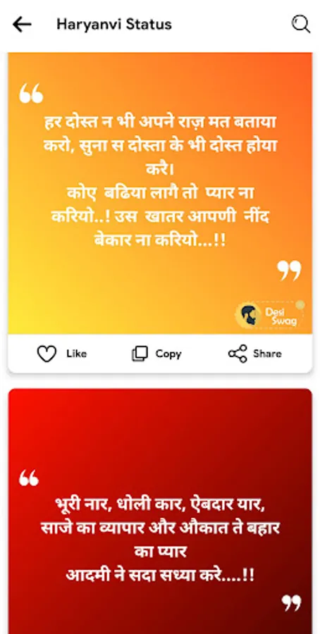 With Haryanvi Status, you can now add a desi twist to your social media profiles, chats, or anywhere you want to make a statement. Our app offers a vast collection of handpicked Haryanvi status messages that capture the essence of the language, allowing you to connect with others on a deeper level.