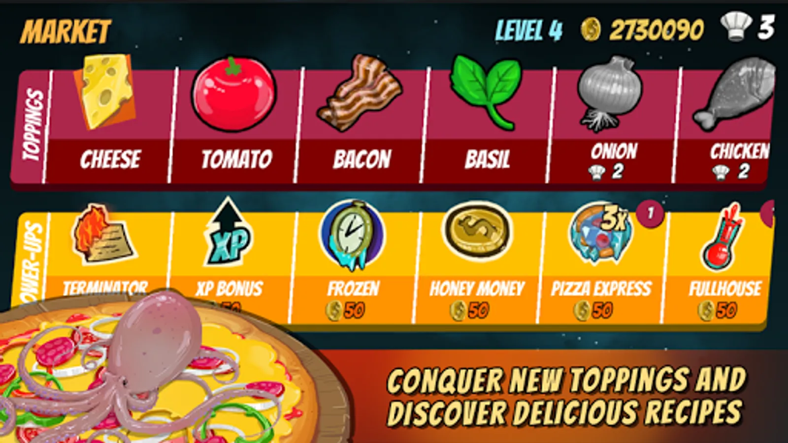 - More than 20 kinds of toppings for your pizza recipes: cheese, tomato sauce, pepperoni, olive, lobster, chocolate, whipped cream, mushroom, corn, onion, octopus, fish, pepper, egg, bacon and more;