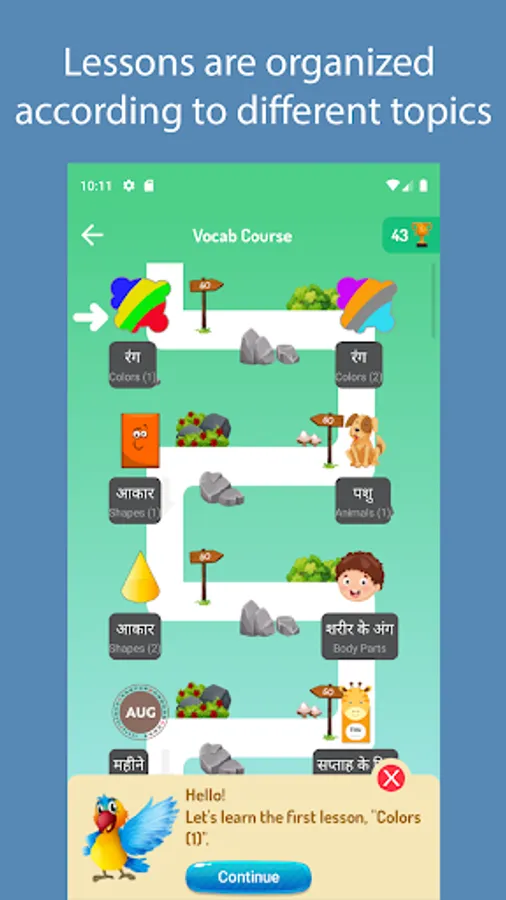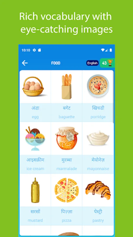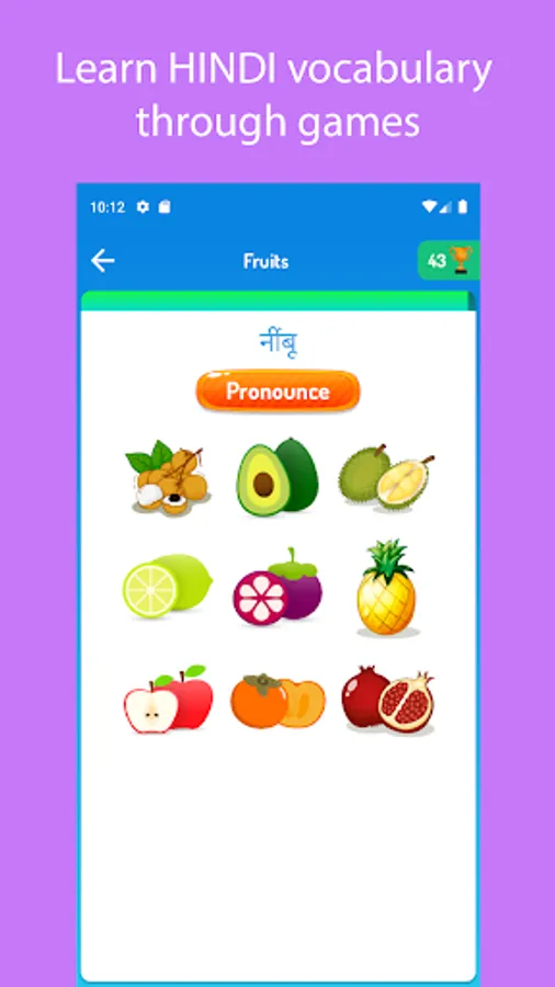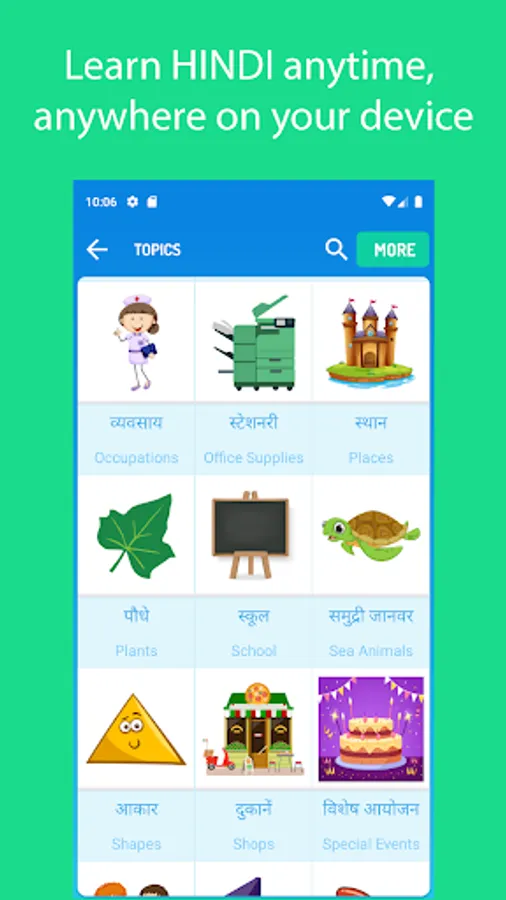 Our Hindi learning app will help you learn Hindi language effectively through fun and intuitive activities. All words are illustrated with correct pronunciation.