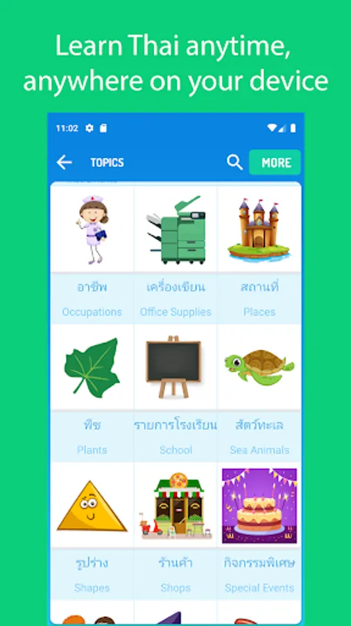 ★ Learn Thai vocabulary through eye-catching pictures and native pronunciation. We have 60+ vocabulary topics in the app.