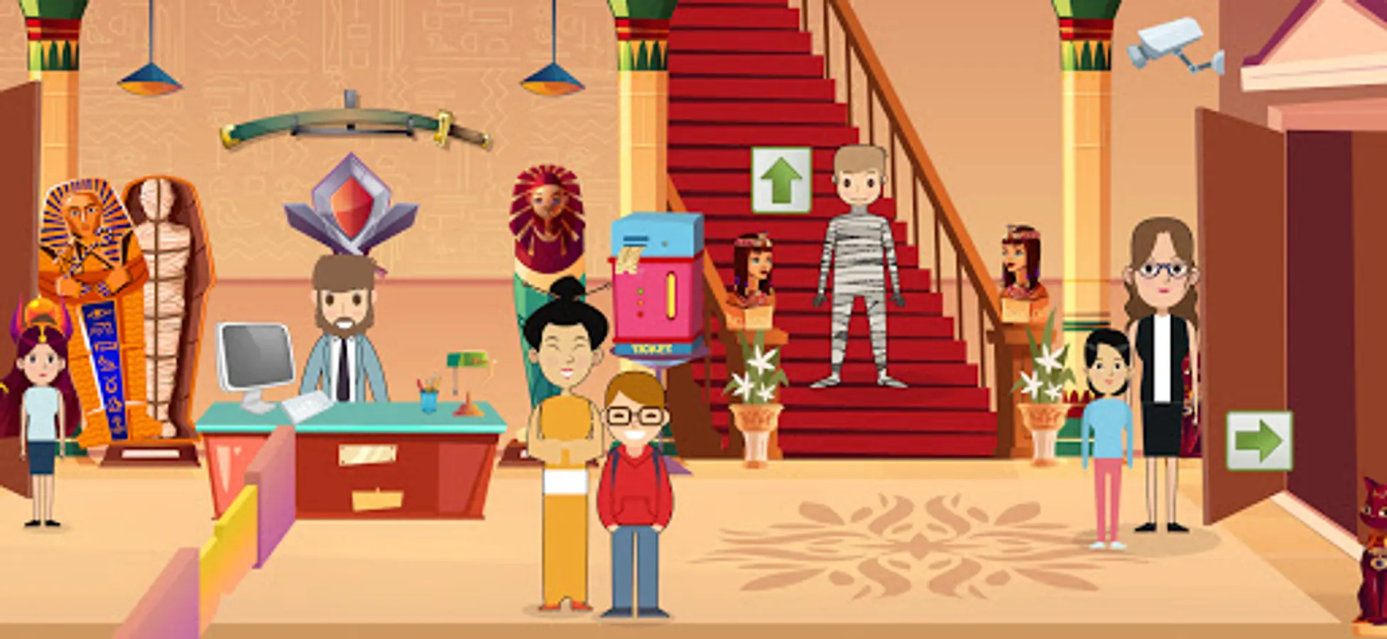 Role play as a egyptian and create your own stories featuring a treasure pretend museum. Play caveman games and be the egyptain king in this exciting pretend world filled with alot of museum hidden treasures. The never ending fun at the my museum town adventure. Take the taxi and stop by the front desk to pick up your tickets so you can visit our multiple themed exhibits in a pretend museum adventure.. Discover the different ancient things in the museum-like animal skeletons, ancient guns, and books, coins, gold large tanks, etc. You can explore other virtual rooms in the museum-like coins and pearl rooms to make your trip more interesting. Pretend town museum has everything you need for a fun outdoor trip with friends and family.