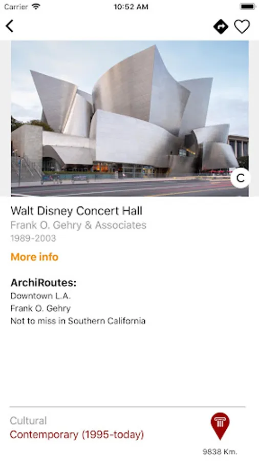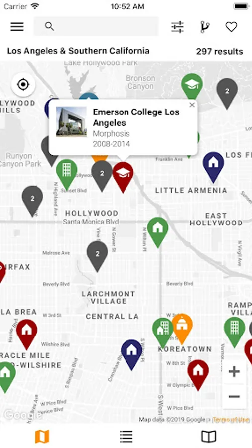 ArchiMaps has two main navigation modes: map and list. Map allows you to search architecture works by their geographic location and relate them with your own position; list shows buildings sorted by proximity, date, or alphabetically. From both of them, you can access a facts screen of each architecture work.