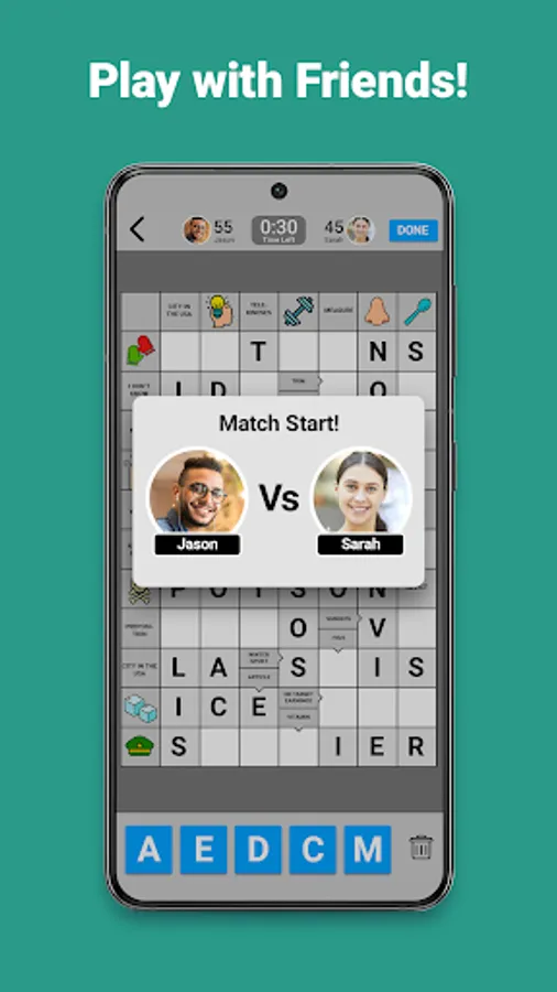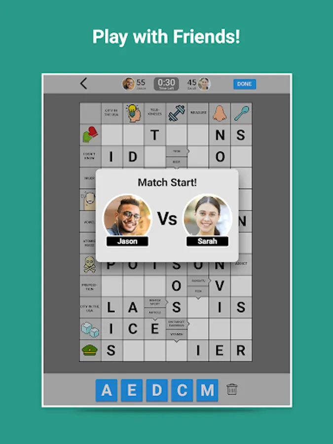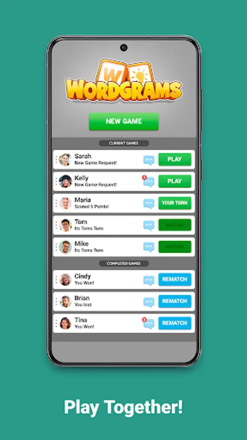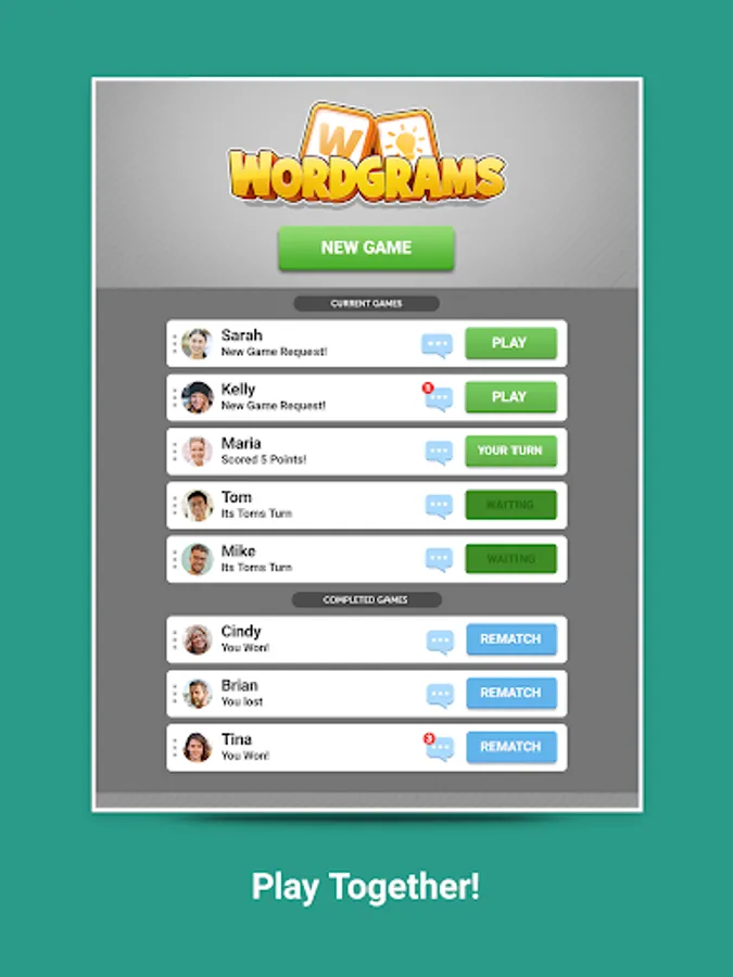 Play with friend, random opponents, or the Wordgrams friendly teacher, Sophie, for immediate games.