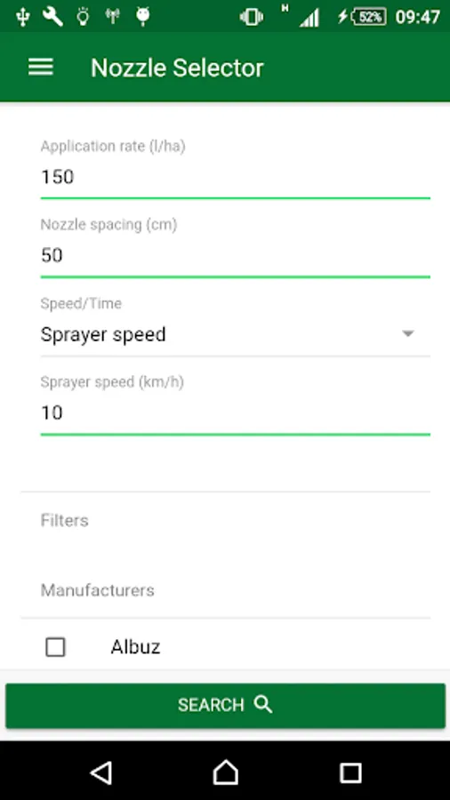 Instead of having to look for the right nozzle in the various catalogs available, ABCpontas can list the most suitable models for the service quickly. It is only necessary to provide the application rate, spacing between the nozzles on the sprayer boom and the desired speed. The list is already ordered, that means the top one is the most appropriate. It has three filters that can be used to refine the search, it is possible to choose the nozzle manufacturer, droplet size and nozzle type. If the application does not find an optimal nozzle, it already offers the user suggestions for changes, such as application rate or speed, for example, to find an option.