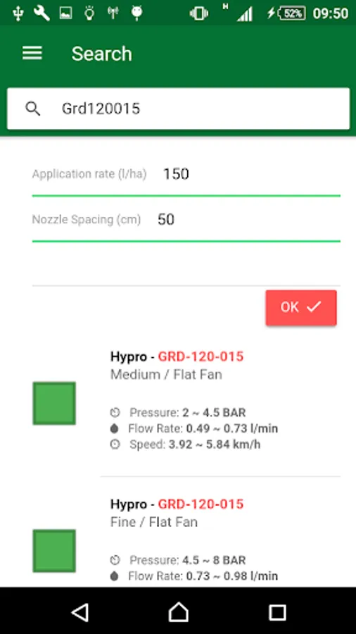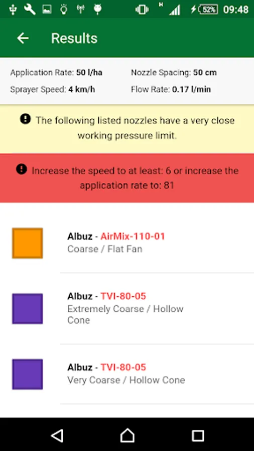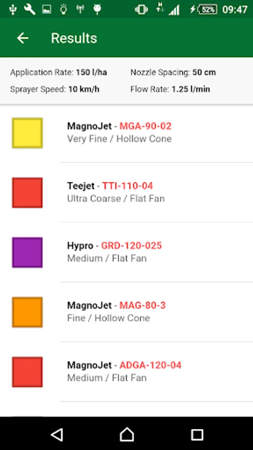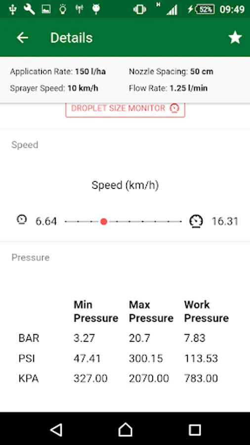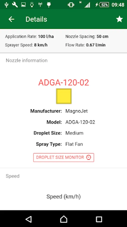 By choosing a nozzle and clicking on it, the application brings information like manufacturer, model and color. Below is a graph showing the speed range required to maintain drop size and working pressure.