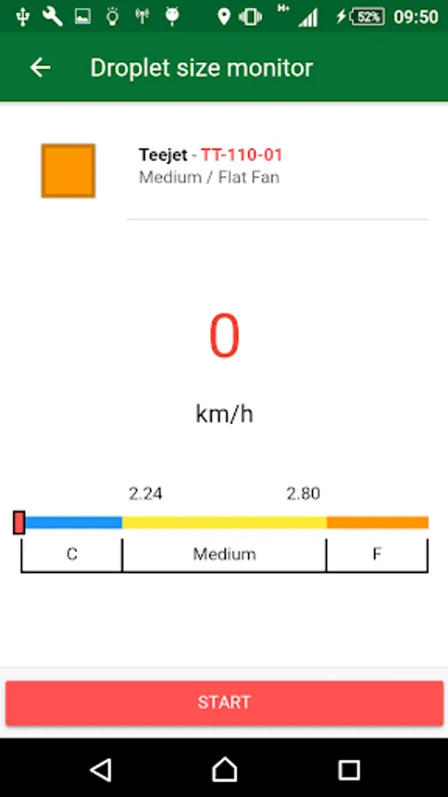 In addition, it has the Speedometer, which allows the user to monitor the droplet size while spraying. Just enter the application rate (L/ha), the nozzle spacing and the chosen nozzle. Then just follow the screen if the drop sizes are ideal, as recommended by the consultant. But for this function you need a device with GPS antenna.