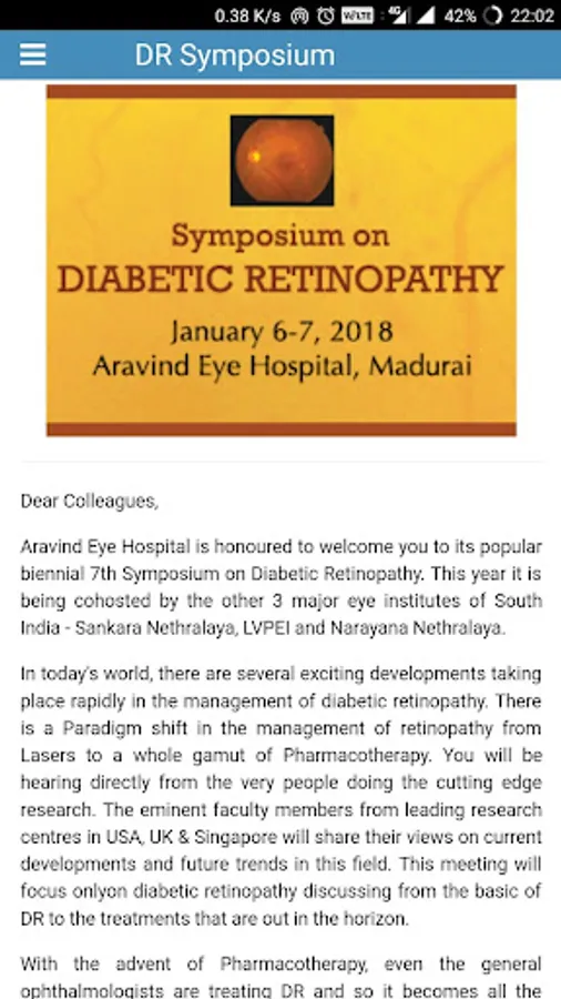 Aravind Eye Hospital is honoured to welcome you to its popular biennial 7th Symposium on Diabetic Retinopathy. This year it is being cohosted by the other 3 major eye institutes of South India - Sankara Nethralaya, LVPEI and Narayana Nethralaya.