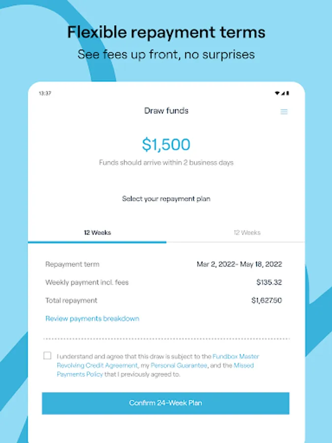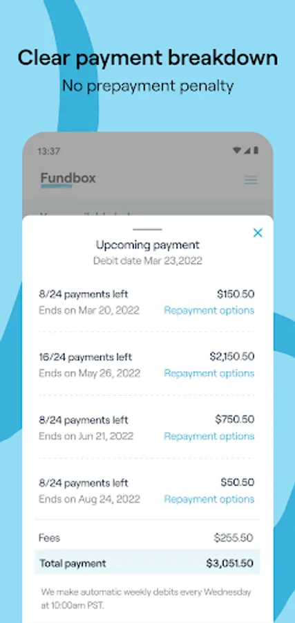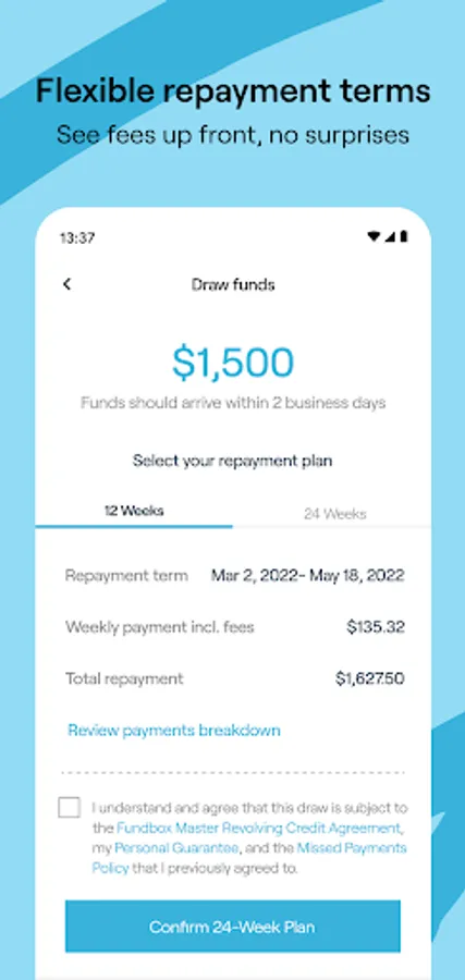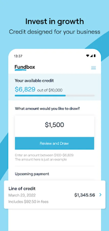 Funds at your fingertips: The Fundbox mobile app is a faster, more flexible way to access credit at a moment’s notice. Download the free app, apply for credit, get a fast decision, and if approved, draw funds right away.