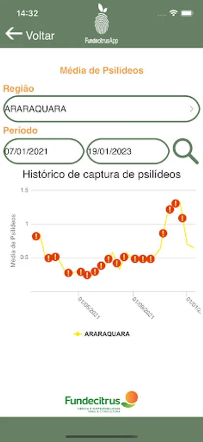 The tool shows the evolution of the greening index (HLB) over time through graphs (HLB Incidence Graph), maps with the disease situation by plot and the psyllid capture rates by plot (Psyllid Incidence Map). In the Collections menu, it is possible to enter information regarding the psyllids collected in the yellow traps inserted in the Phytosanitary Alert system.