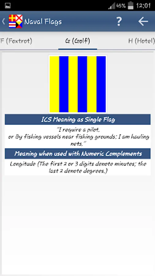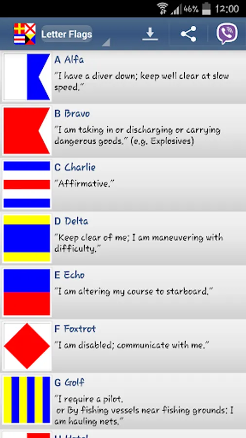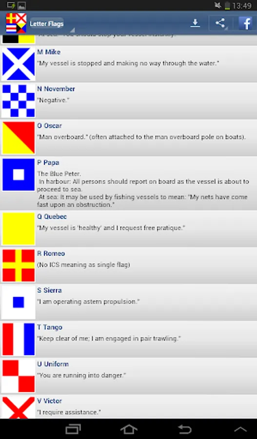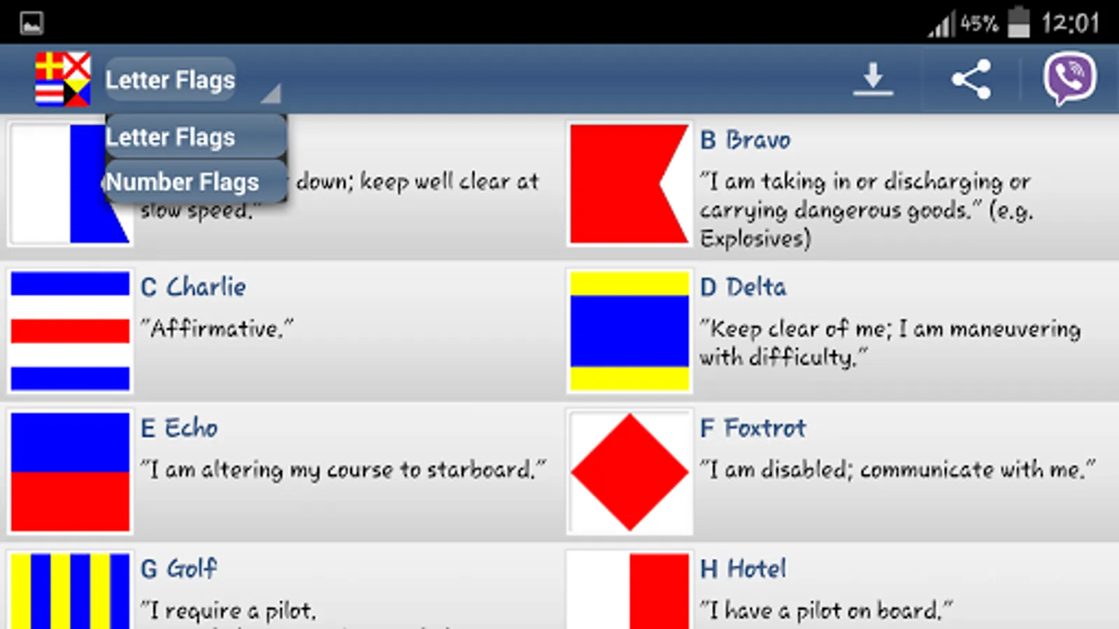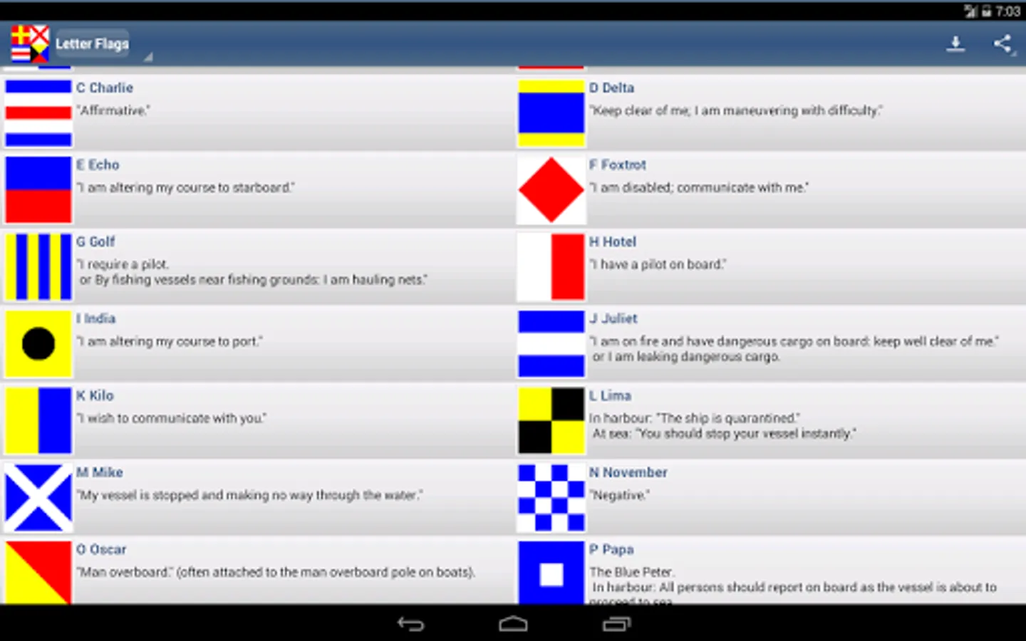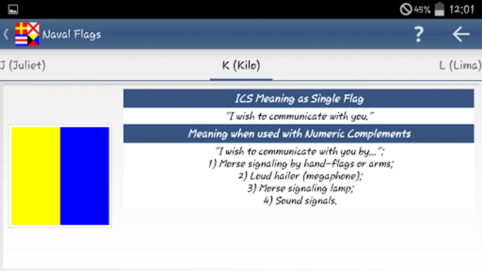 "Nautical Flags" teaches you all signal flags which are used to communicate with messages, at times because radio silence is required. The system of international maritime signal flags is one system of flag signals representing individual letters of the alphabet in signals to or from ships. It is a component of the International Code of Signals.