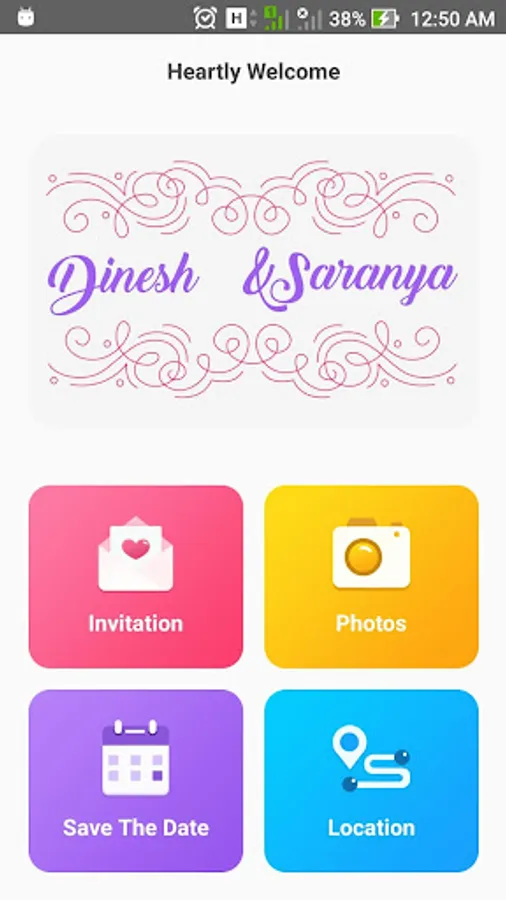 A completely customized & personalized wedding invitation app with invitation(English & Tamil), photo gallery of bride & groom, remainder with wedding time counter and map & direction to ensure a hassle free and a comfortable journey for the guest :)
