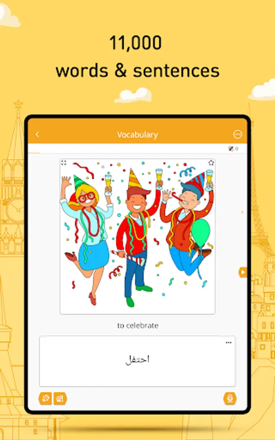 β’ 6,000 Arabic words (constantly growing): the most common nouns, verbs, adjectives, etc., categorized into 10 levels and 200 topics;