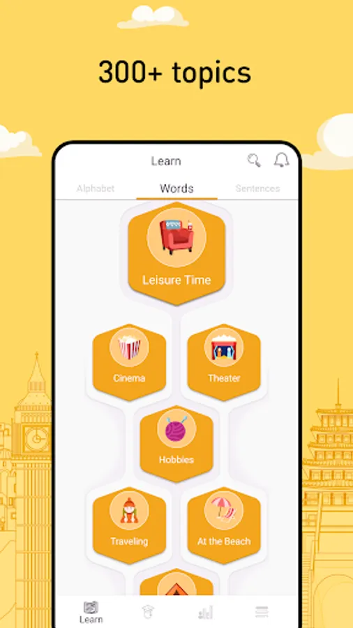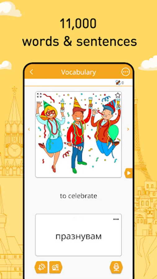 β’ 6,000 Bulgarian words (constantly growing): the most common nouns, verbs, adjectives, etc., categorized into 10 levels and 200 topics;