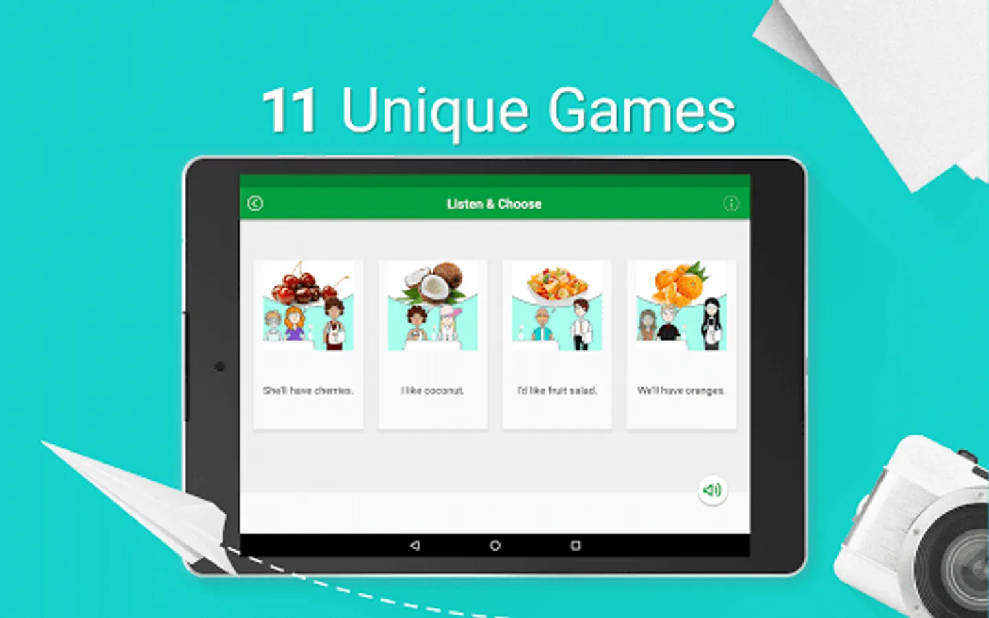 ✔ 11 fun games – a innovative approach to practice your listening, writing and speaking skills.