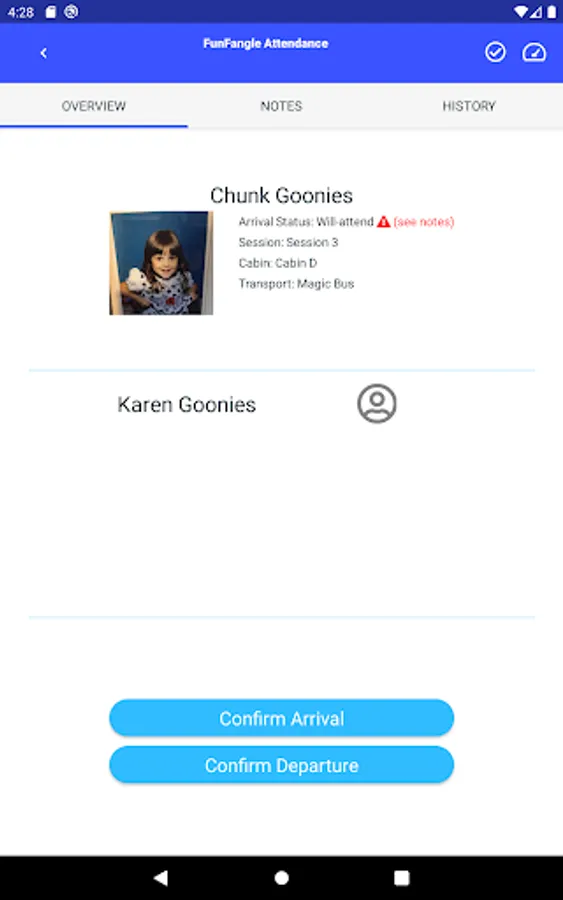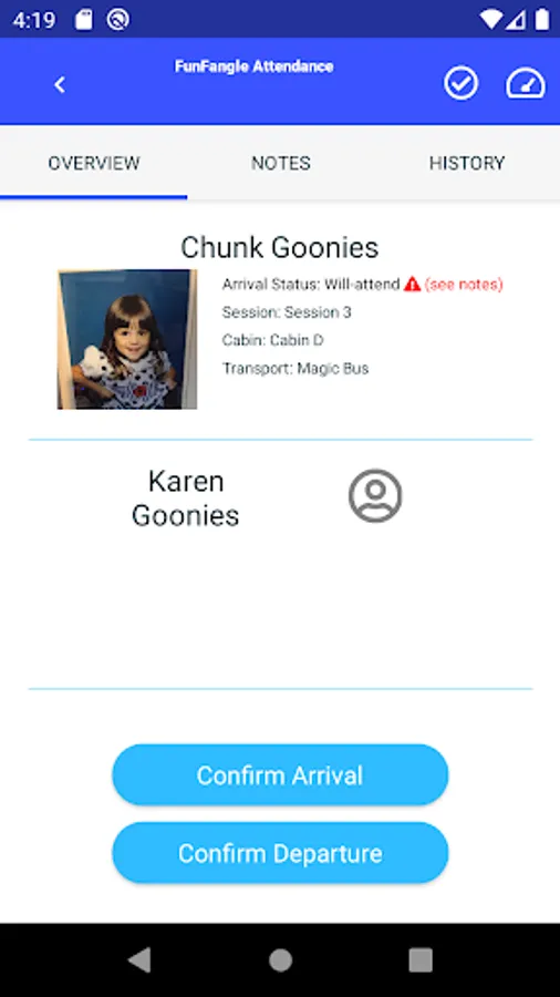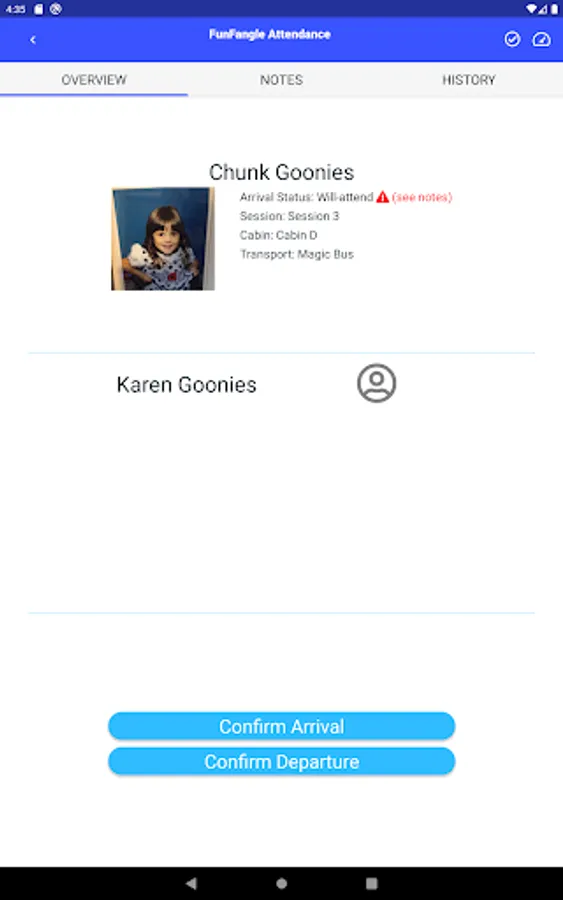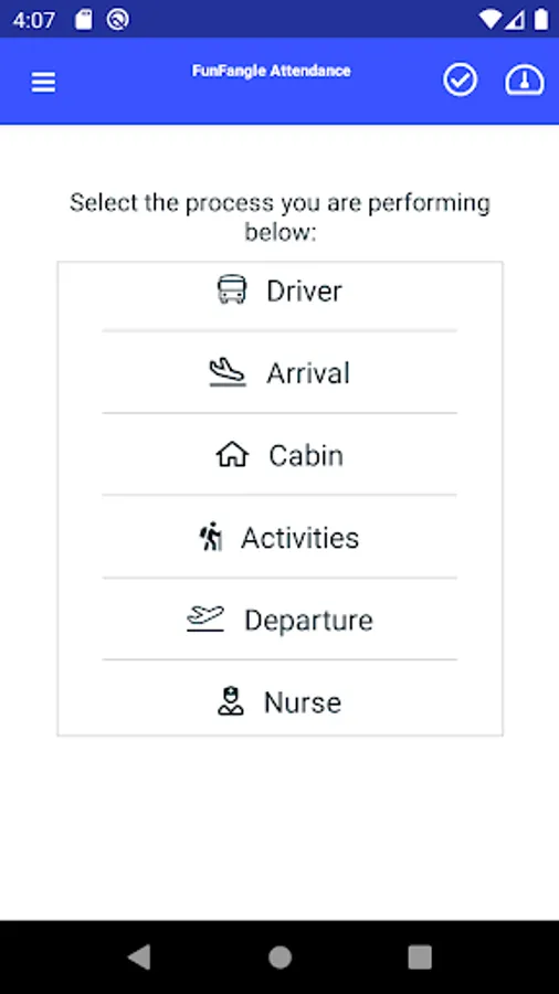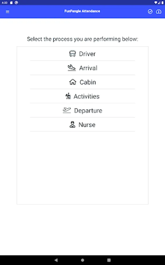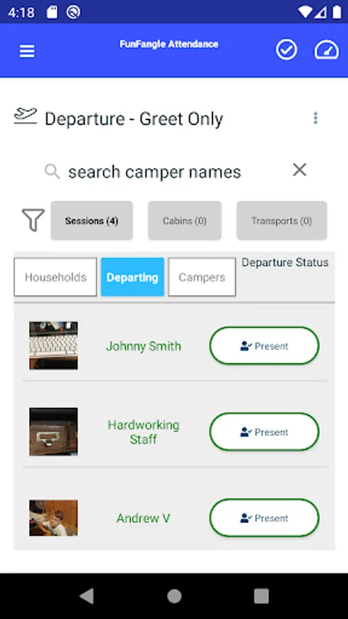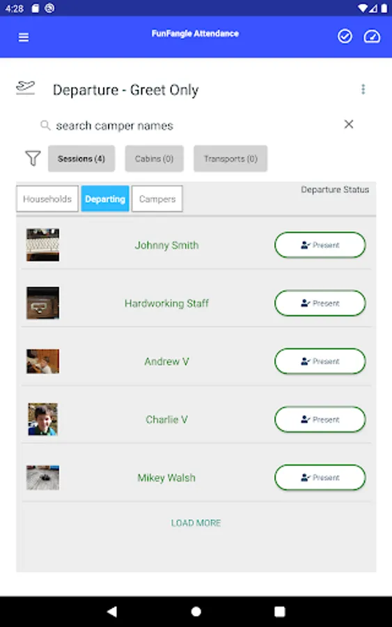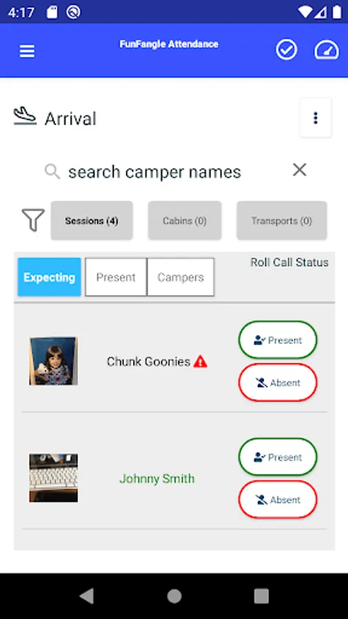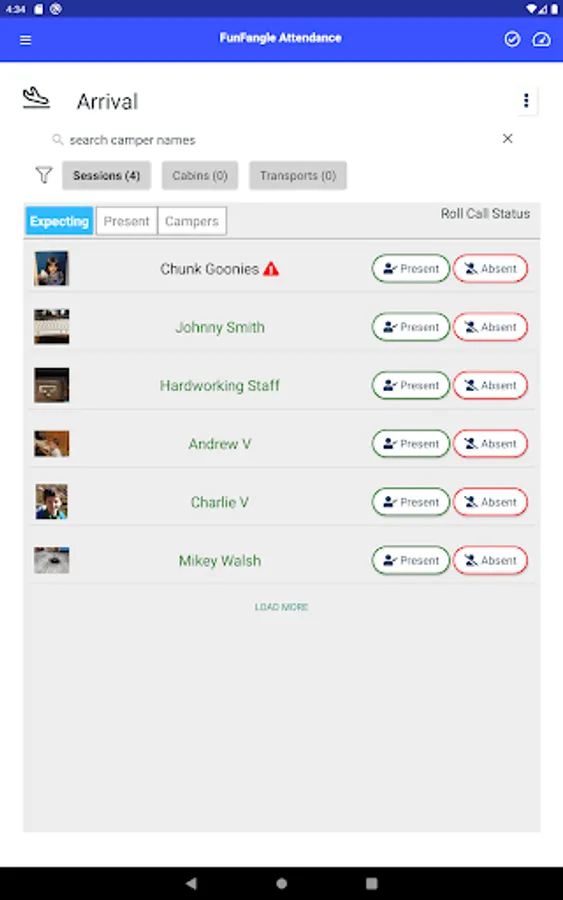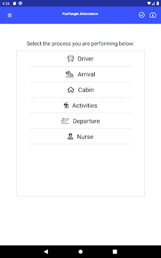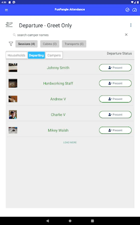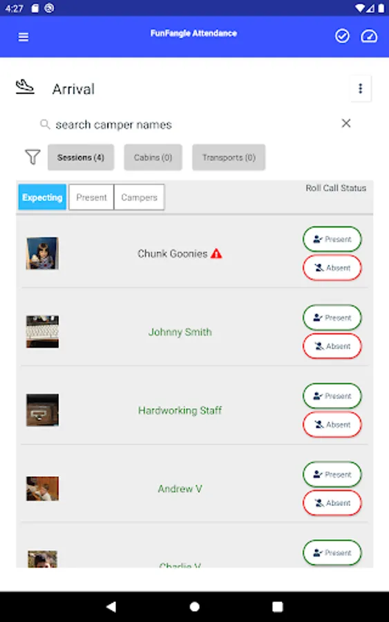 Attendance app for summer camps, day camps, schools, pools, gyms, and recreational organizations. For camps and schools, it provides roll calls for transportation, arrival, and meeting places (such as cabins), and for tracking pickup of campers. It also provides check-in and tracking of daily activities. For pools, gyms, etc., provides reservation creation and tracking, checkin upon entry via tap or QR code, and verification of membership to control entry.