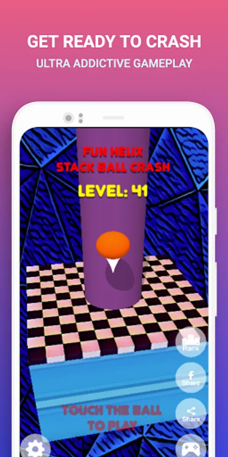 You will jump and crush the ball through colorful helix platforms. Your stack ball goes down as you touch the screen but you are not allowed to hit the dark platform stacks. When you crush the dark ines, it's all over! Your ball will crash and break into pieces and you have to restart the level.