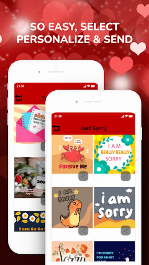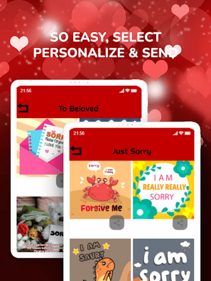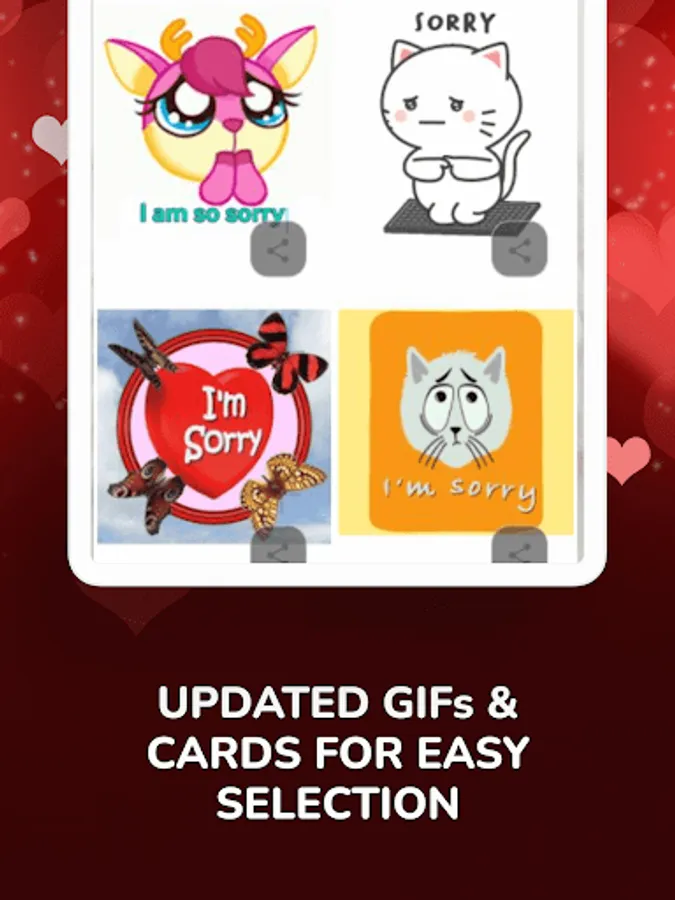 Apology I am Sorry Messages Cards Wishes GIFs App is 100% free and is available for Android users. Sharing free greeting cards & wishes is very easy with this app. Browse through our calming collection of exclusively edited Apologetic Images and choose your favourite greeting cards all occasions. Press on share tab on the bottom right of your selected image, enter your personalized message and click on SHARE text! It is that simple!