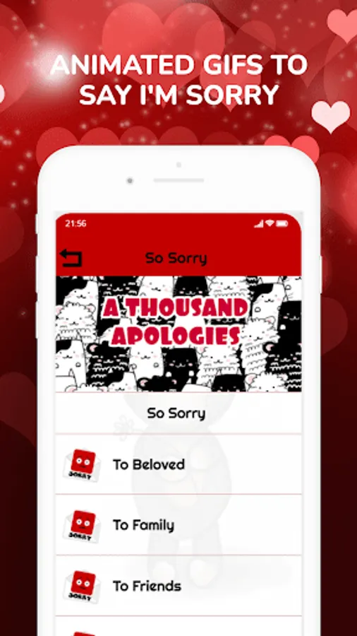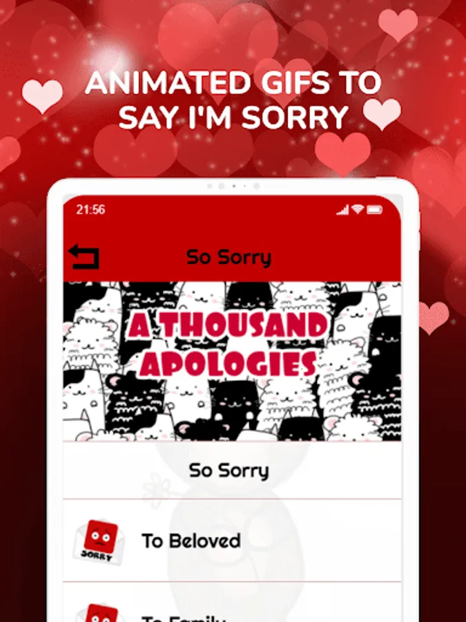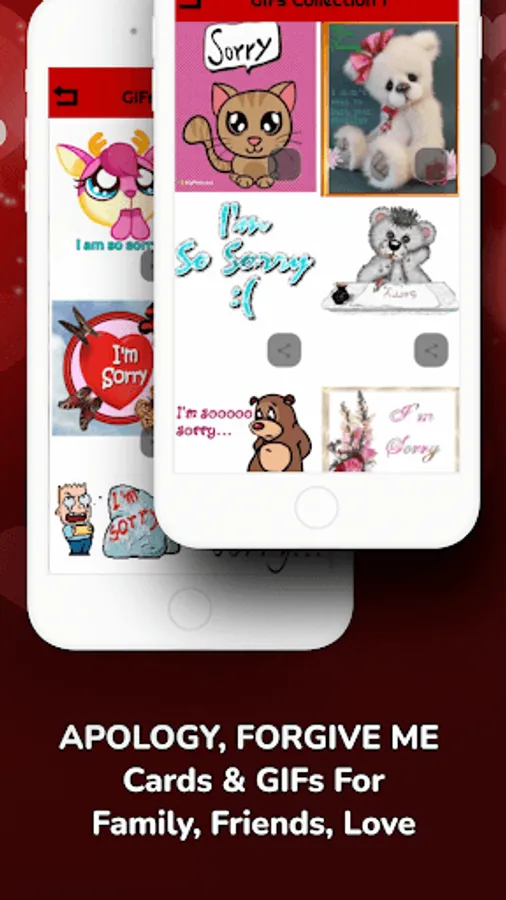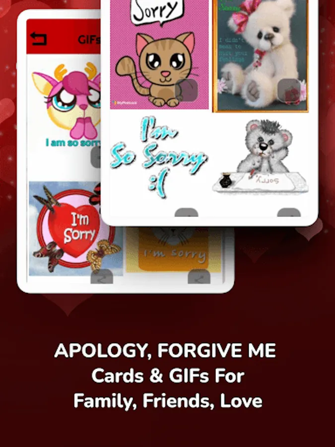 Apology I am Sorry Messages Cards Wishes GIFs App gives you access to the latest collections, apology I am sorry greeting cards & wishes in the form of ecards and animation GIFs. The greeting cards are perfect for all occasions. The apologetic images and apology messages with forgive me quotes are carefully selected to help you put the conflict behind and move on more easily.