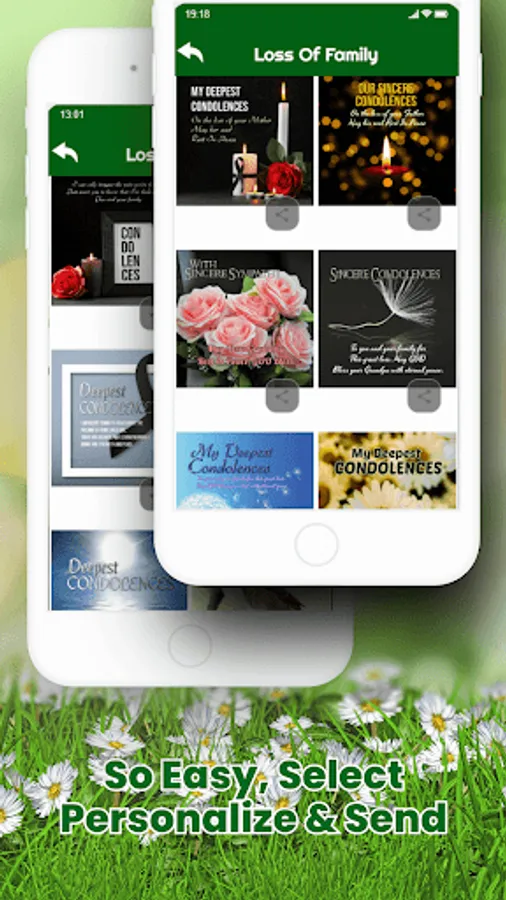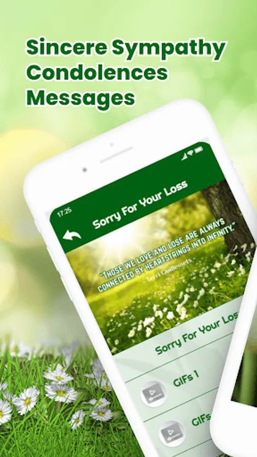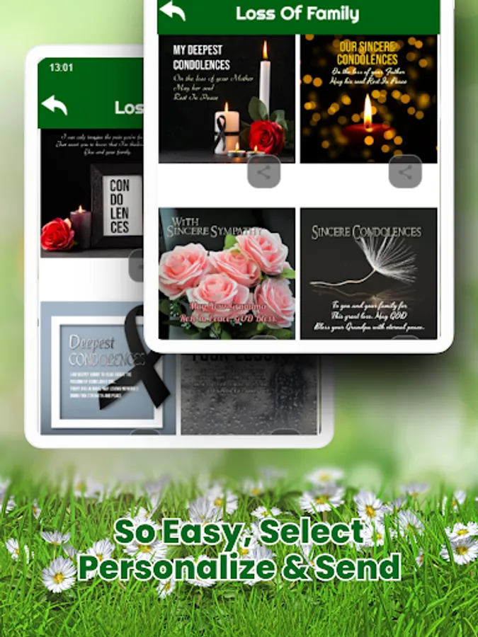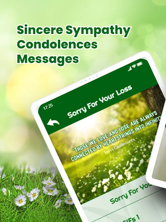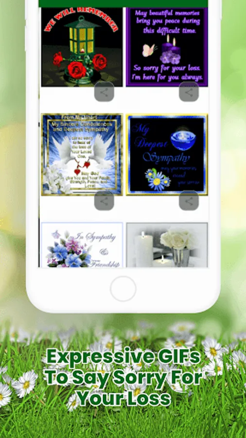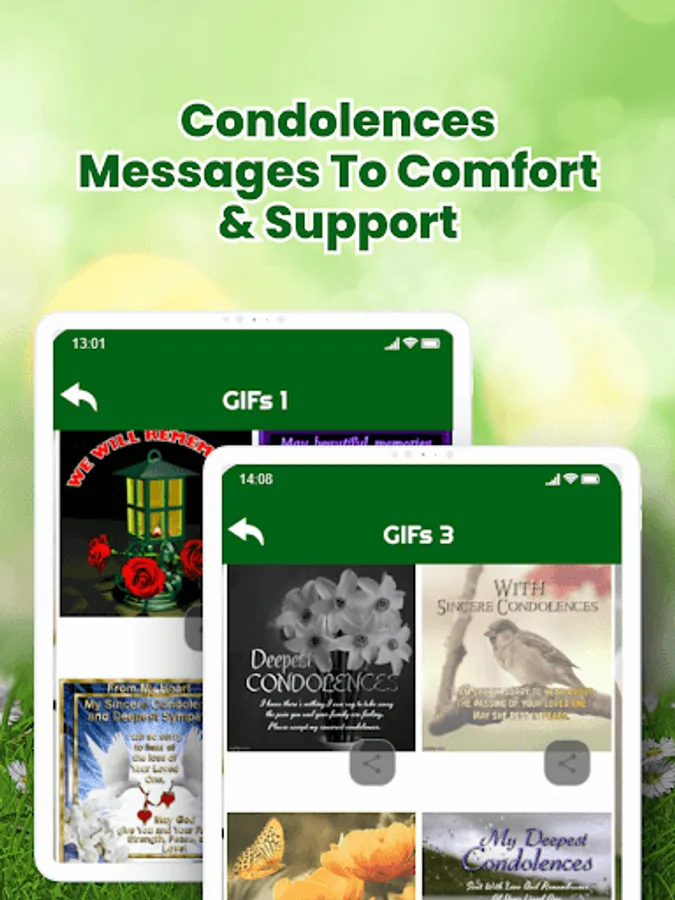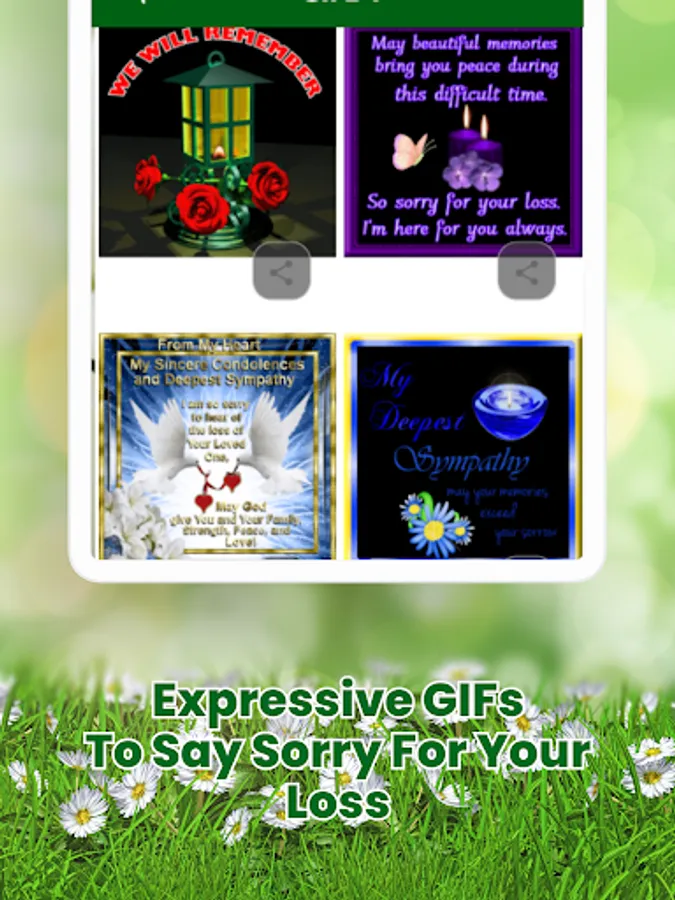 Condolences Sympathy Messages Greeting Cards Wishes GIFs App is 100% free and is available for Android users. Sharing free greeting cards & wishes is very easy with this app. Browse through our calming collection of exclusively edited condolences sympathies Images and choose your favourite greeting cards all occasions. Press on share tab on the bottom right of your selected image, enter your personalized message and click on SHARE text! It is that simple!