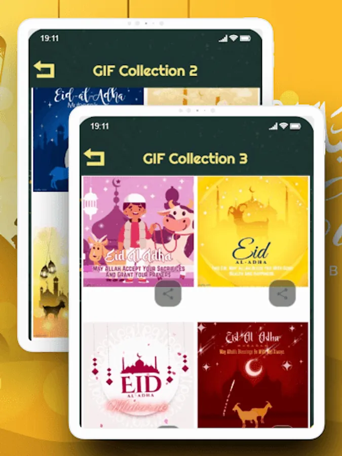 Eid Al Adha Eid Mubarak Wishes GIFs App is a free mobile app. This application is available for any Android users. Sharing free greeting cards & wishes is very easy with this app. Browse through our colourful collection of exclusively edited Eid Al Adha Images and choose your favourite greeting cards all occasions and share! It is that simple!