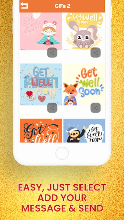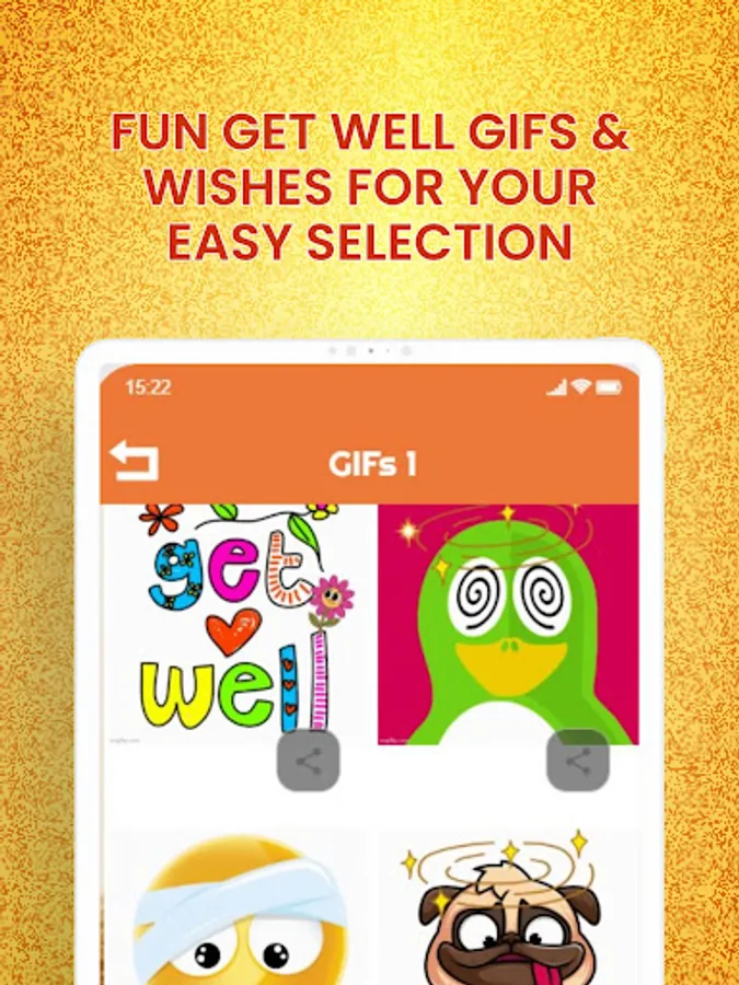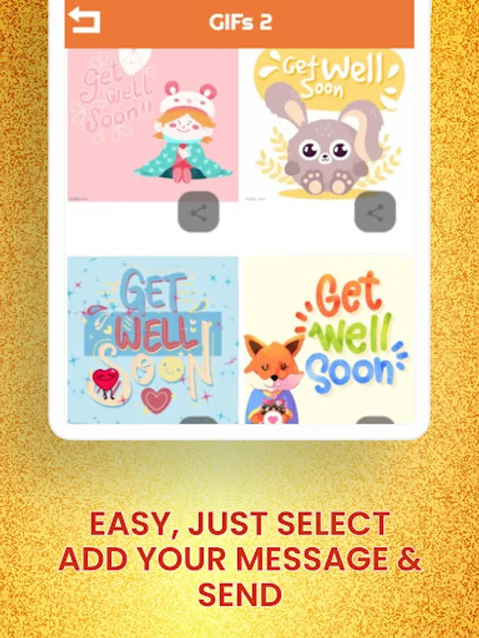 Get Well Soon Greeting Wishes GIFs App is 100% free. This application is available for any Android users. Sharing free greeting cards & wishes is very easy with this app. Browse through our awesome collections of exclusively edited Get well Soon Greeting Animated GIFs Images and choose your favourite greeting cards all occasions and share! It is that simple! There's no limit to the number of Get Well Soon Greeting Cards & Wishes GIFs Images you can send.