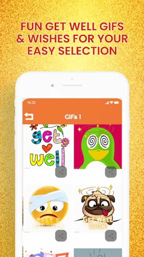 Get Well Soon Greeting Wishes GIFs App provides you with an easy, fast, safe and fun way to share get well soon greeting cards & wishes. Let family and friends who are unwell receive your get well soon greeting cards & wishes and feel your sincere expression of love even if you cannot be with them in person. Select from our collection of awesome meaningful wishes and messages to send out with animated gif greeting cards all occasions to express your sincerity and appreciation for the cherished people in your life.