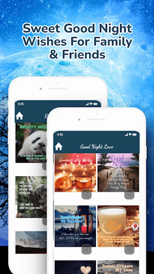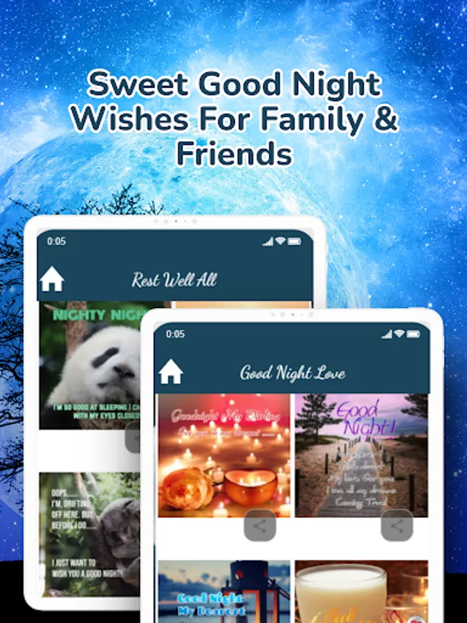 Bring a shiny smile to the faces of your beloved before they drift off to restful sleep every night by sending heartfelt good night messages & blessings with Good Night Quotes Cards Wishes GIFs App.