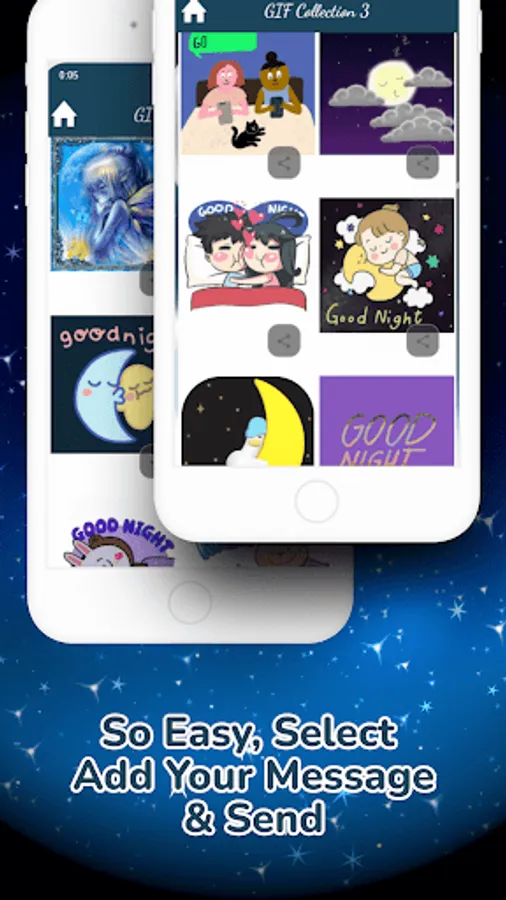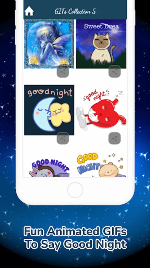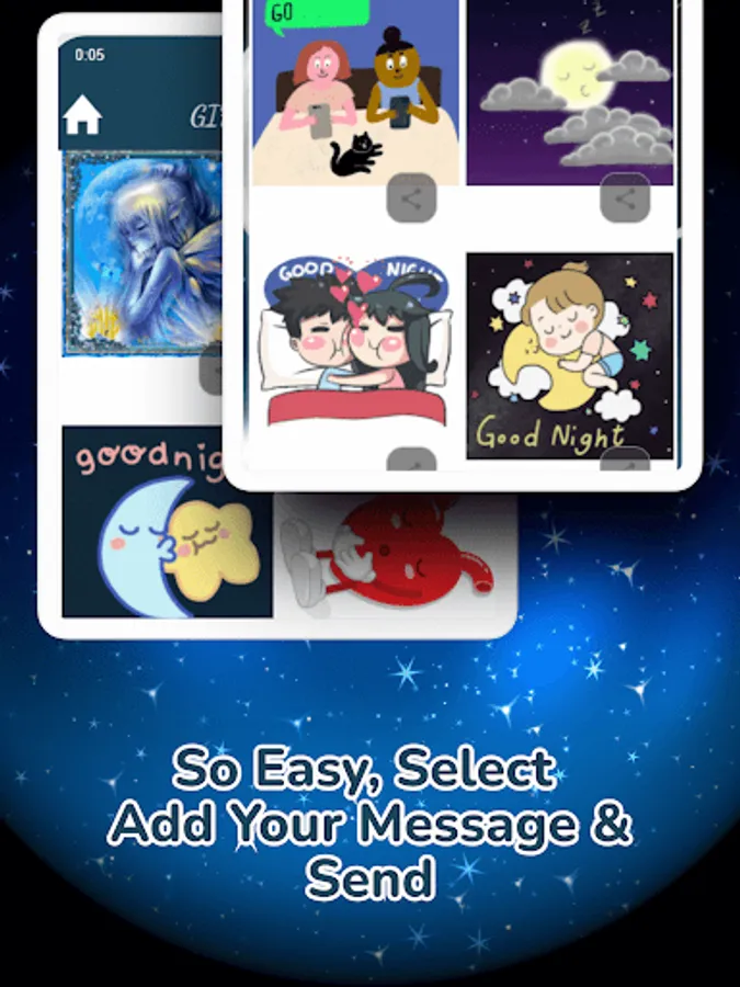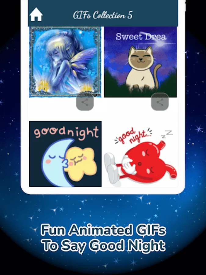Good Night Quotes Cards Wishes GIF App is 100% free and is available for Android users. Sharing free greeting cards & wishes is very easy with this app. Browse through our calming collection of exclusively edited Good Night Images and choose your favourite greeting cards all occasions. Press on share tab on the bottom right of your selected image, enter your personalized message and click on SHARE text! It is that simple!
