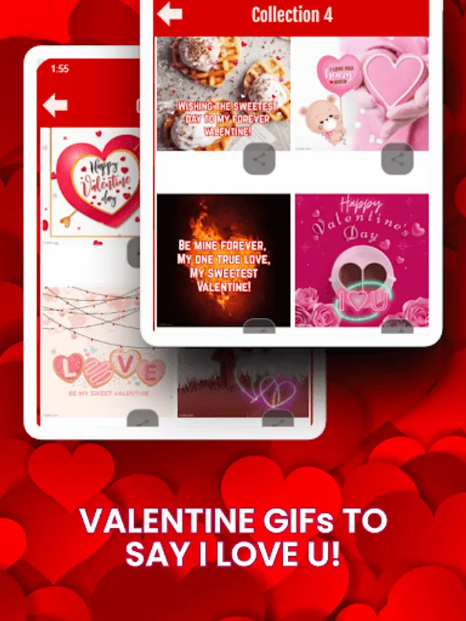 Happy Valentine’s Day Love GIF Images App is 100% free. This application is available for any Android users. Sharing free greeting cards & wishes is very easy with this app. Browse through our sweet romantic collection of exclusively edited Happy Valentine’s Day GIF Images and choose your favourite greeting cards all occasions and share! It is that simple! There's no limit to the number of Happy Valentine’s Day GIF Images and wishes you can send.