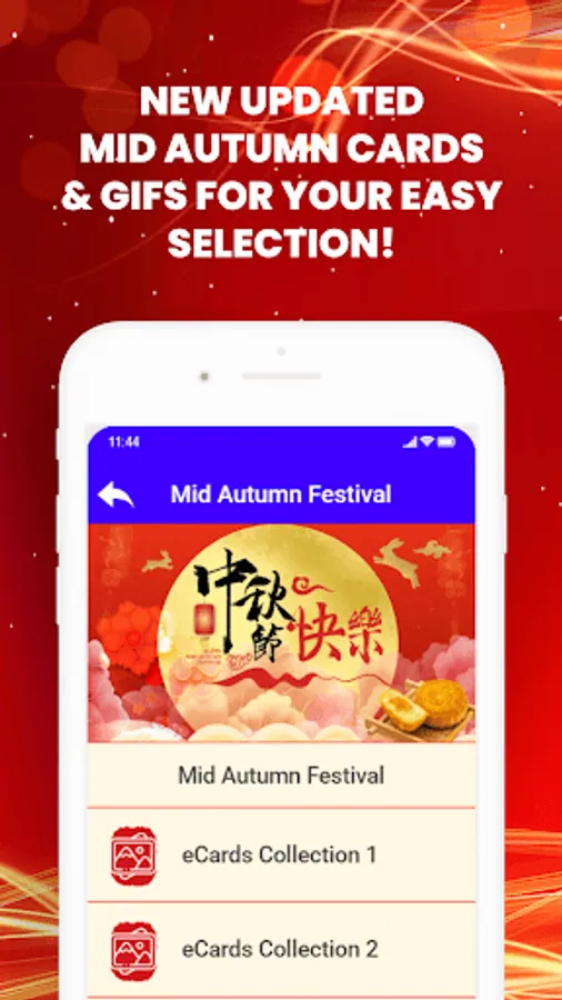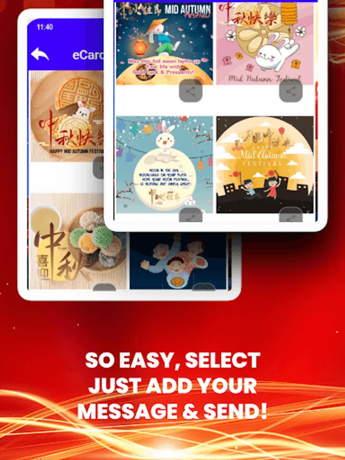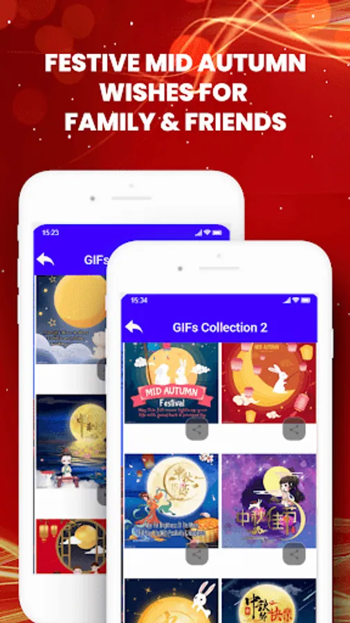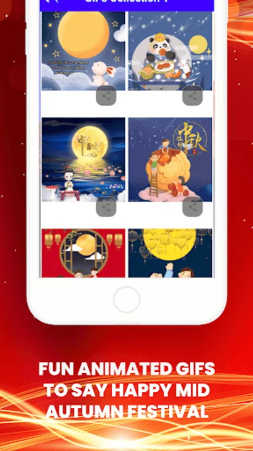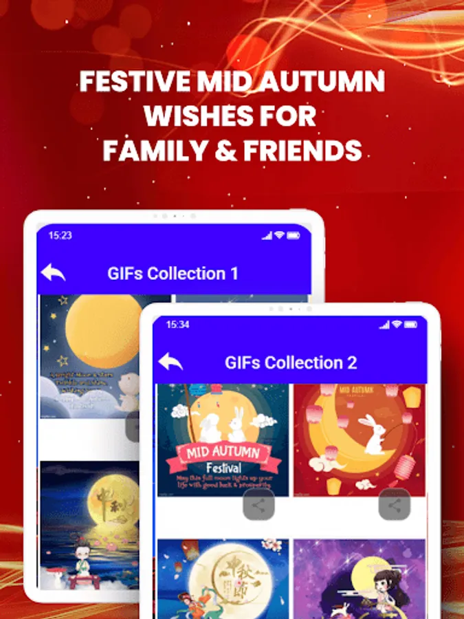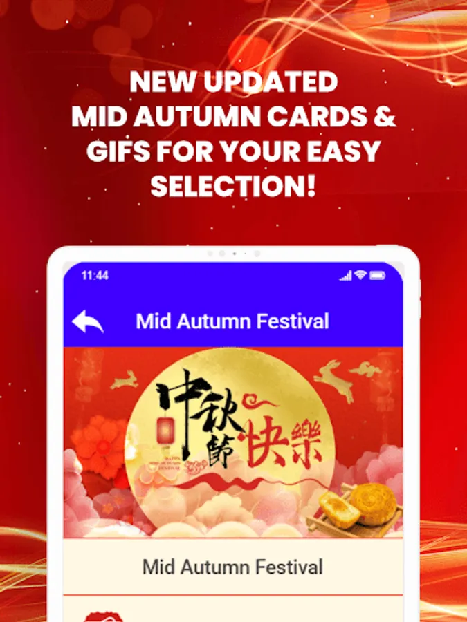 Mid Autumn Mooncake Festival Greeting Cards Wishes GIFs App is 100% free. This application is available for any Android users. Sharing free greeting cards & wishes is very easy with this app. Browse through our colourful collection of exclusively edited Happy Mid Autumn or Mooncake Festival Images and choose your favourite greeting cards all occasions and share! It is that simple!