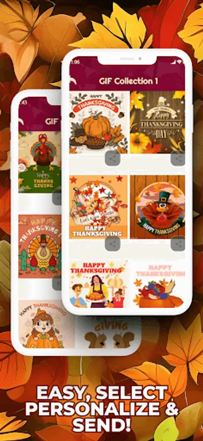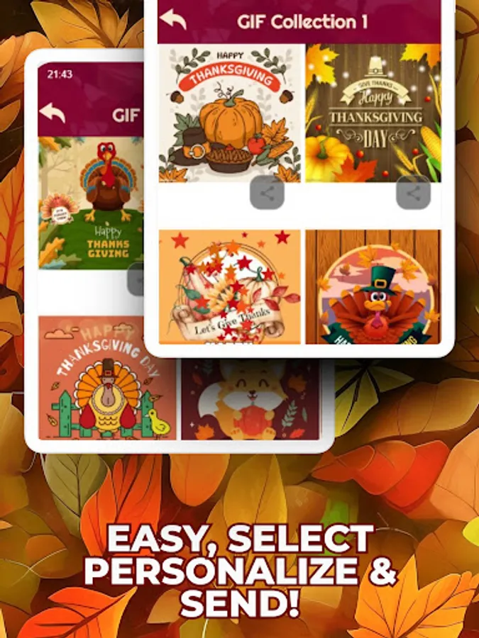 🦃 Easy to use. Just select, personalize and share. Customize the Thanksgiving Day GIF Images with your own messages, or if you're not feeling too creative just send the GIF greeting cards with provided wishes messages.