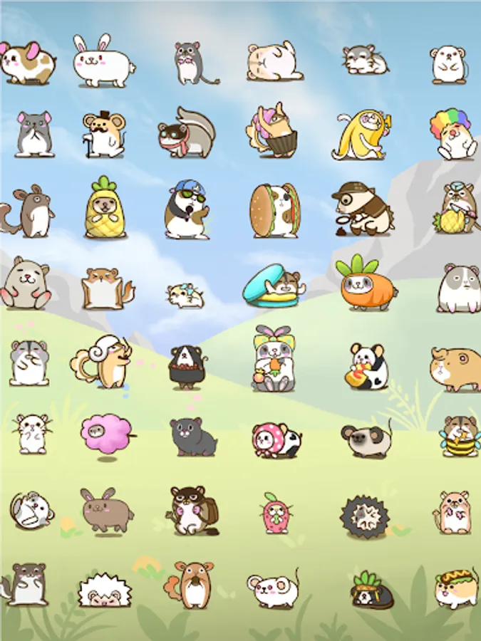 Collect a total of 15 animals. House mouse, panda mouse, squirrel, roborovskii, golden hamster, mouse, dwarf hamster, guinea pig, hedgehog, gerbil, flying squirrel, rabbit, Rat, Chinchilla and Capybara friends will join you.