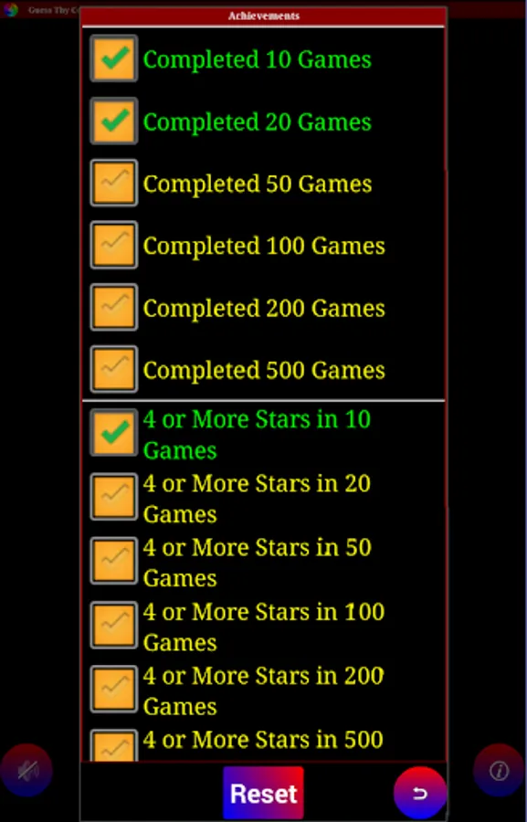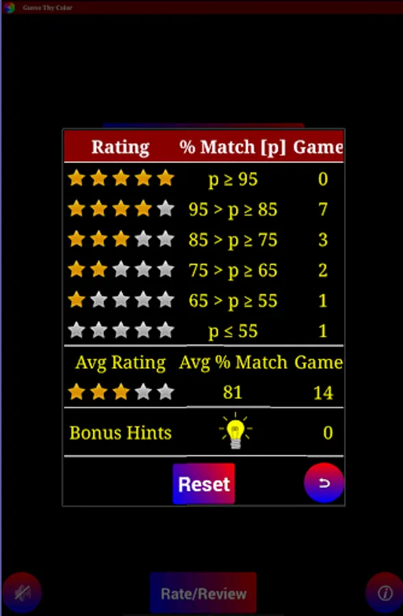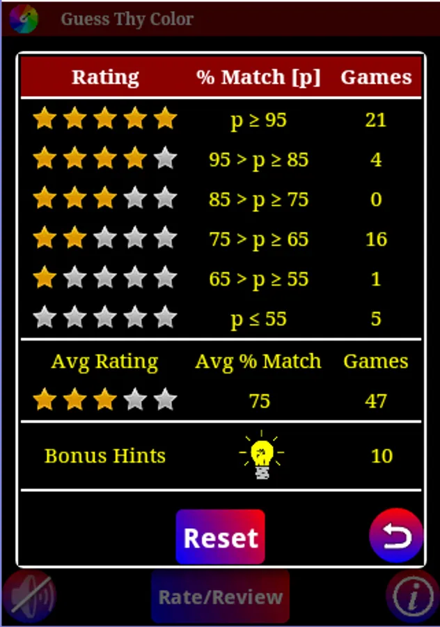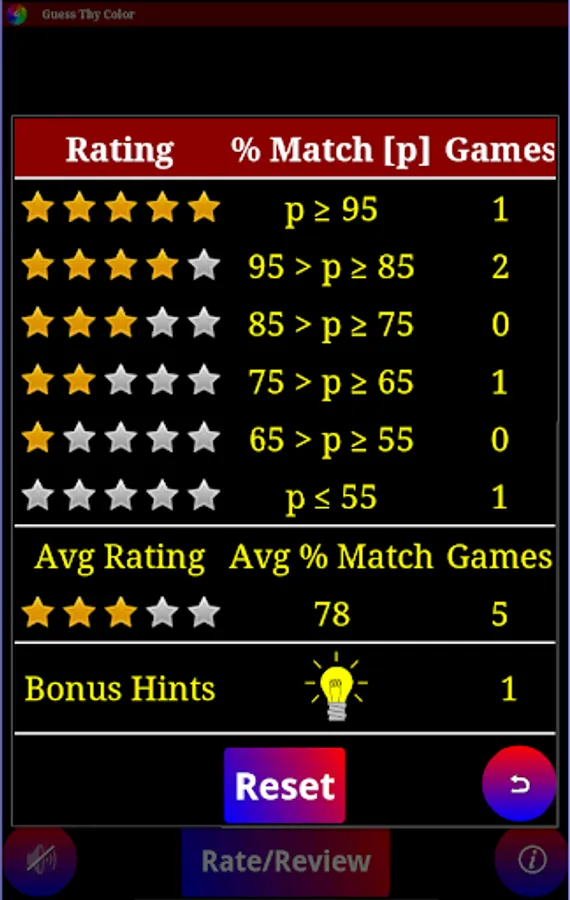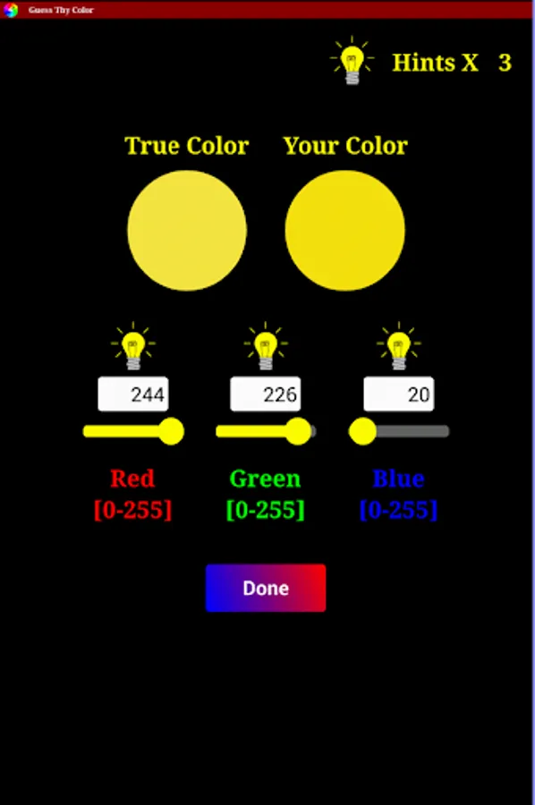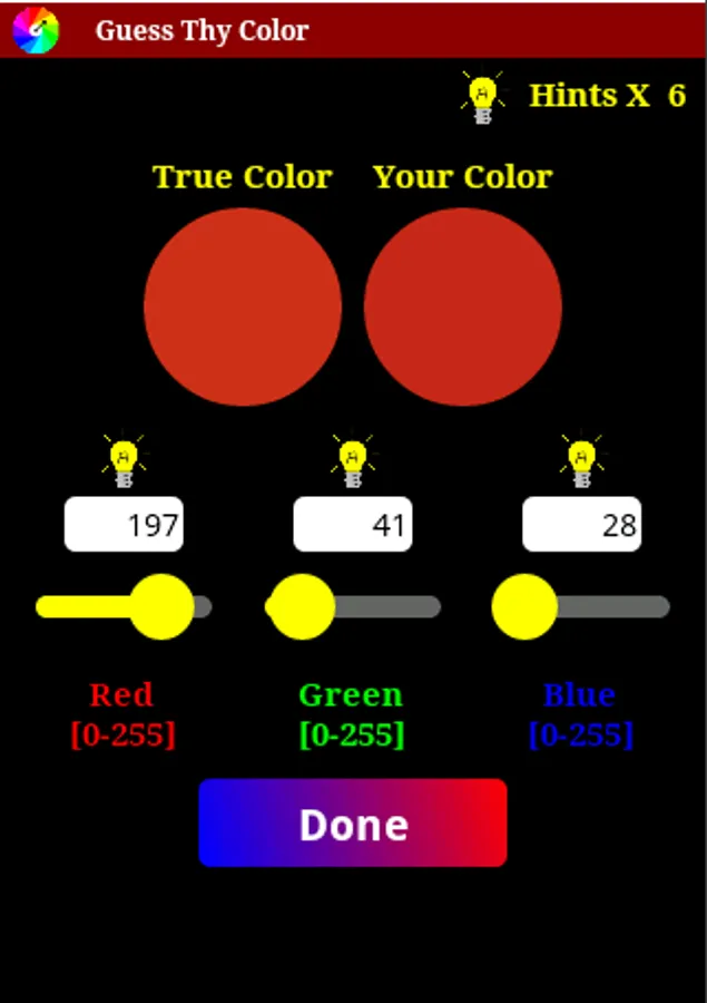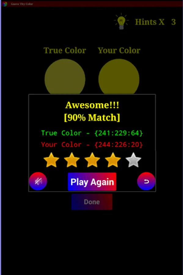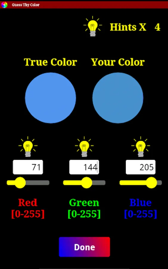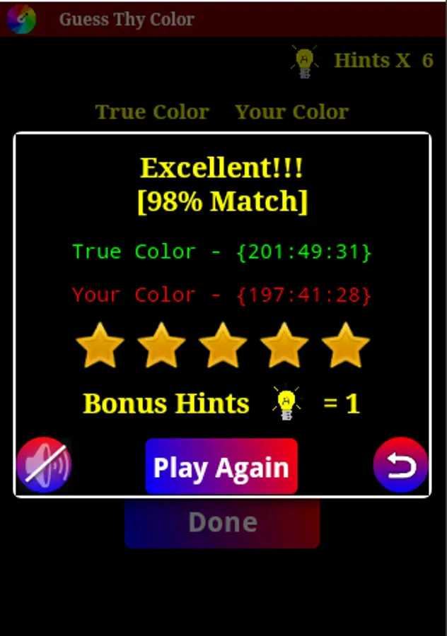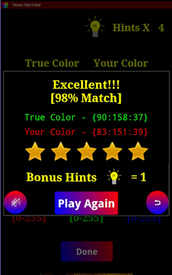 Delve into the fascinating world of Colors with 'GuessThyColor', a unique color matching game by FunGyan. Guess the Red, Green and Blue Components of a given color and try to match your values with the True Color. Closer the match, more the star rating. Earn bonus hints when you get 5 star ratings. Keep track of your matching history using the Statistics page. Challenge yourself by completing the list of Achievements on the Achievements page.