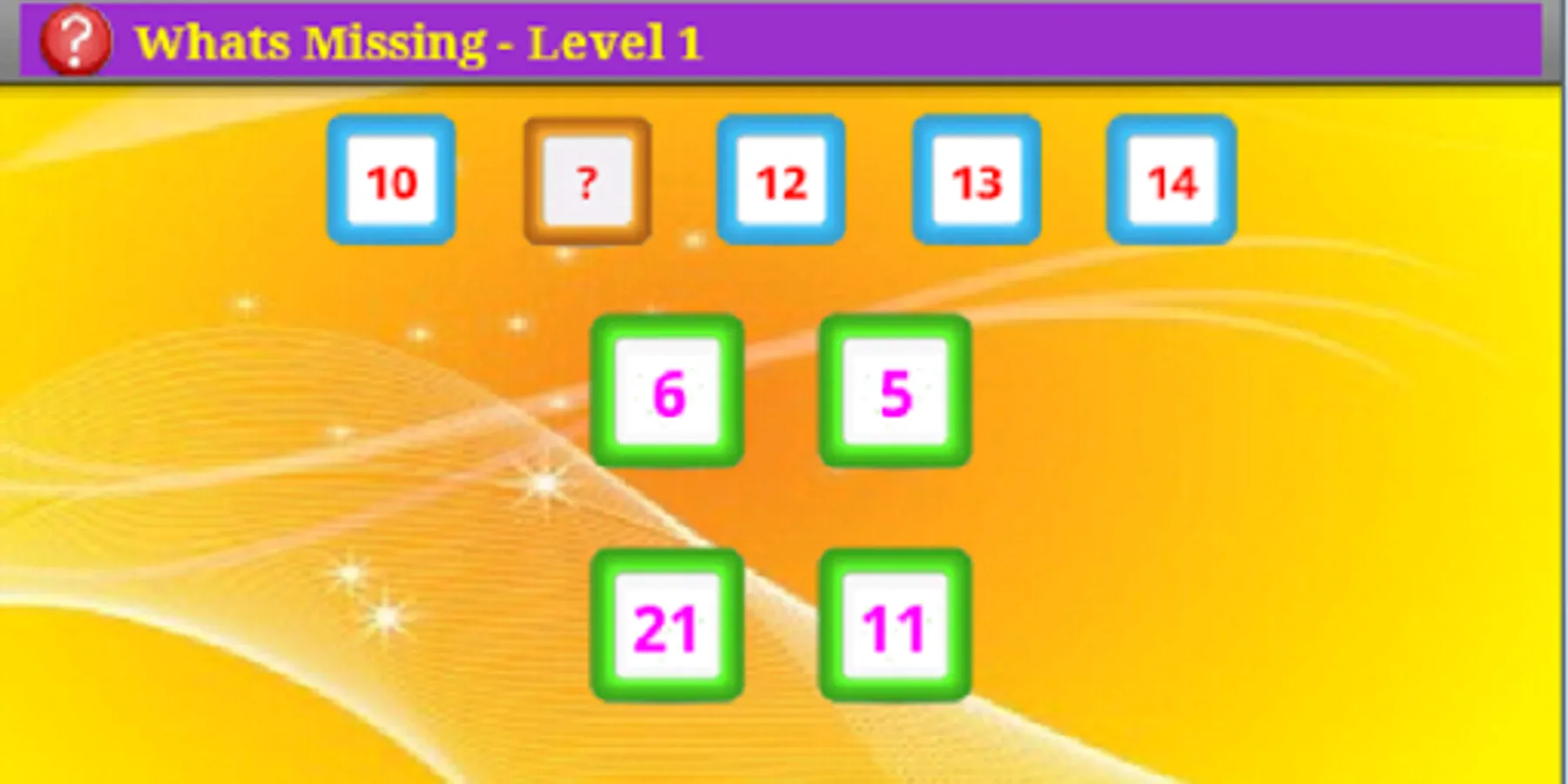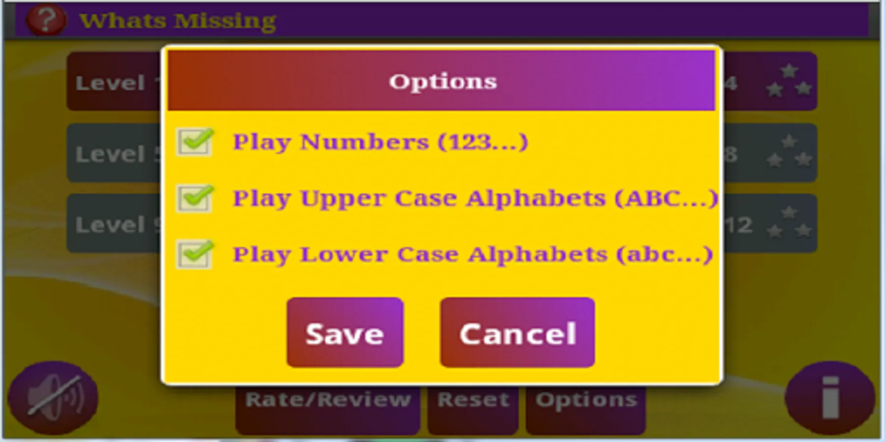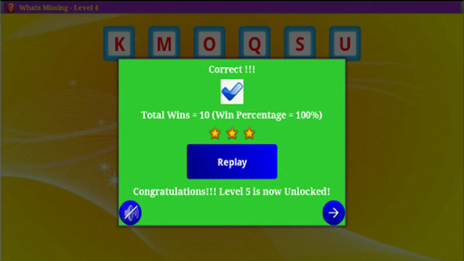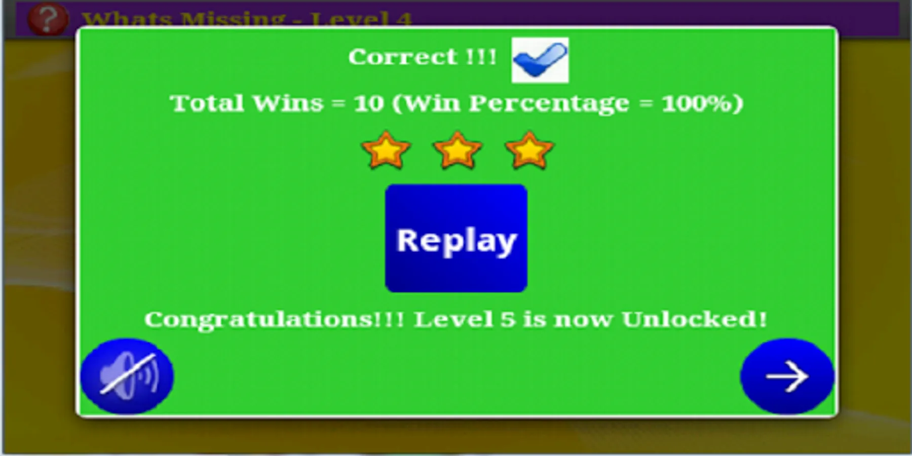 What's Missing provides a simple and fun way of learning number and alphabet sequencing. The player moves to next level by completing minimum number of correct games. After each game the player is shown the statistics of the level like the number of wins and winning percentage. This encourages the player to keep going for higher achievements.