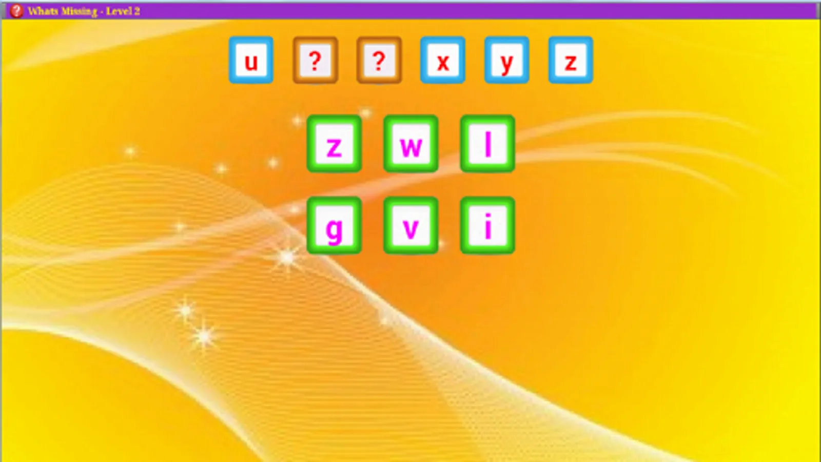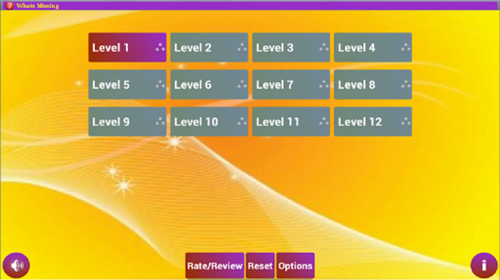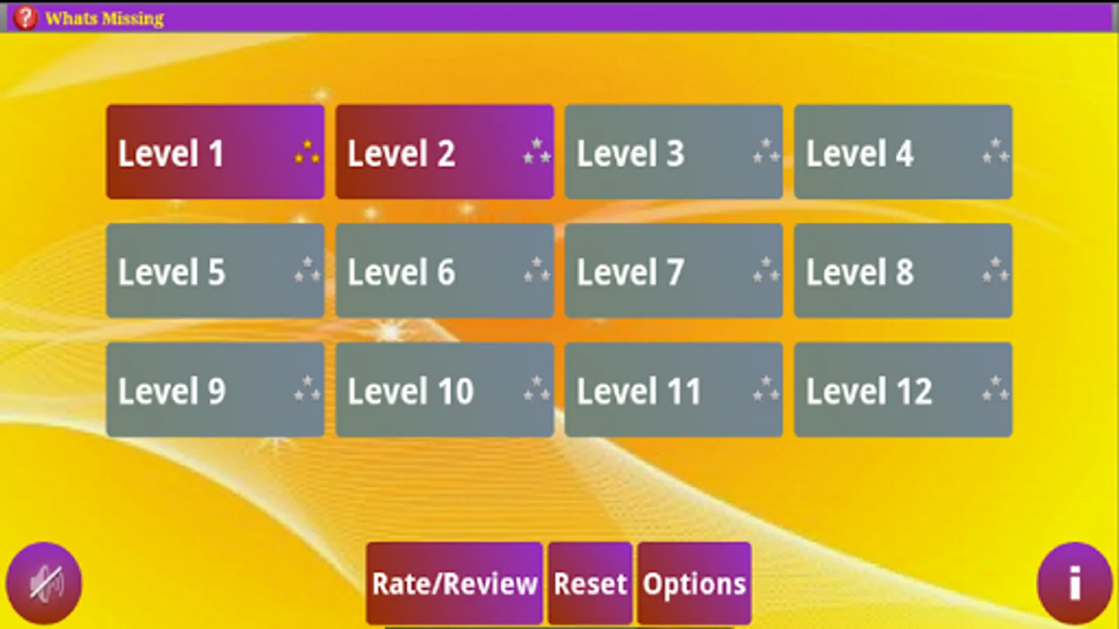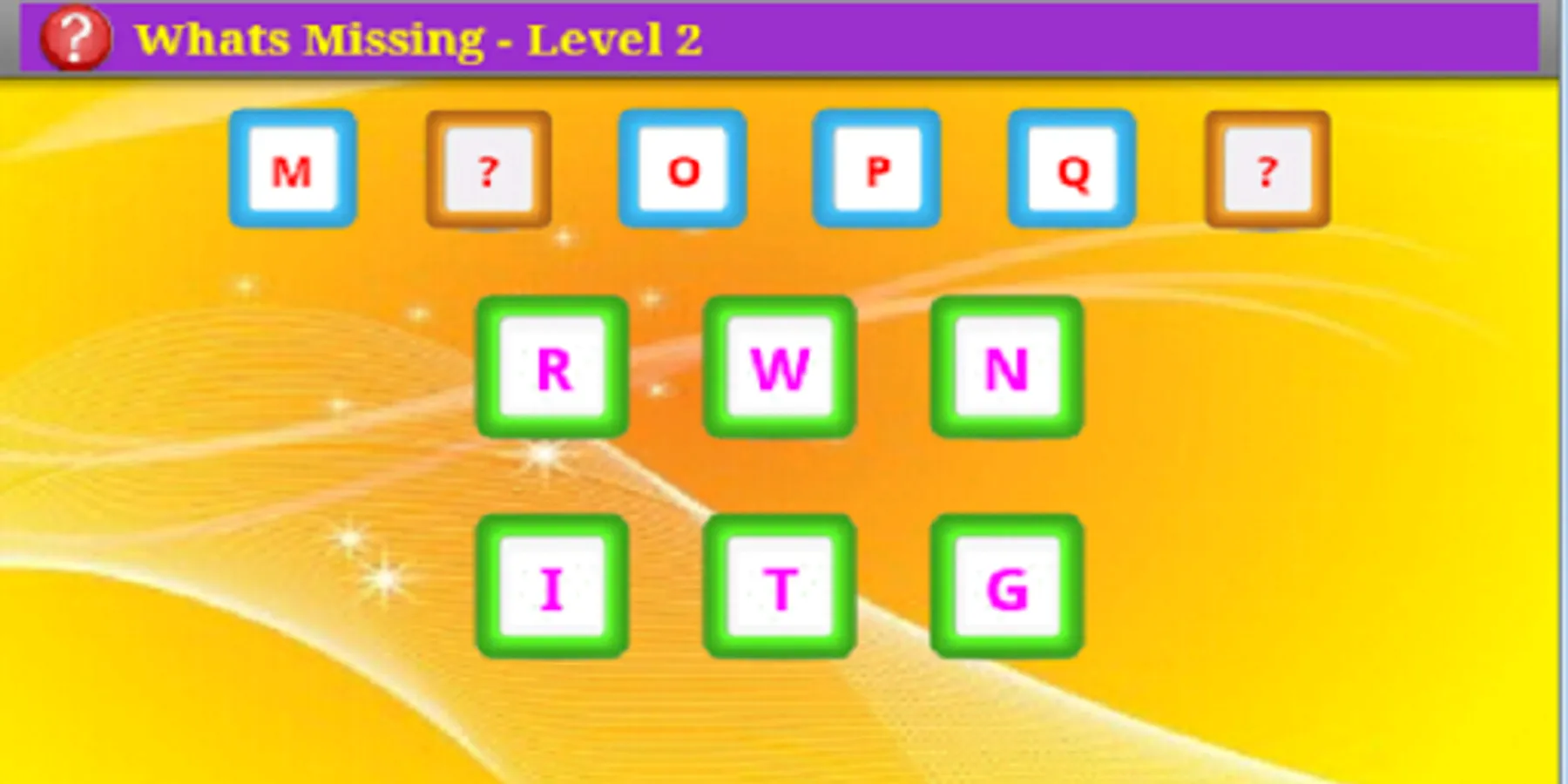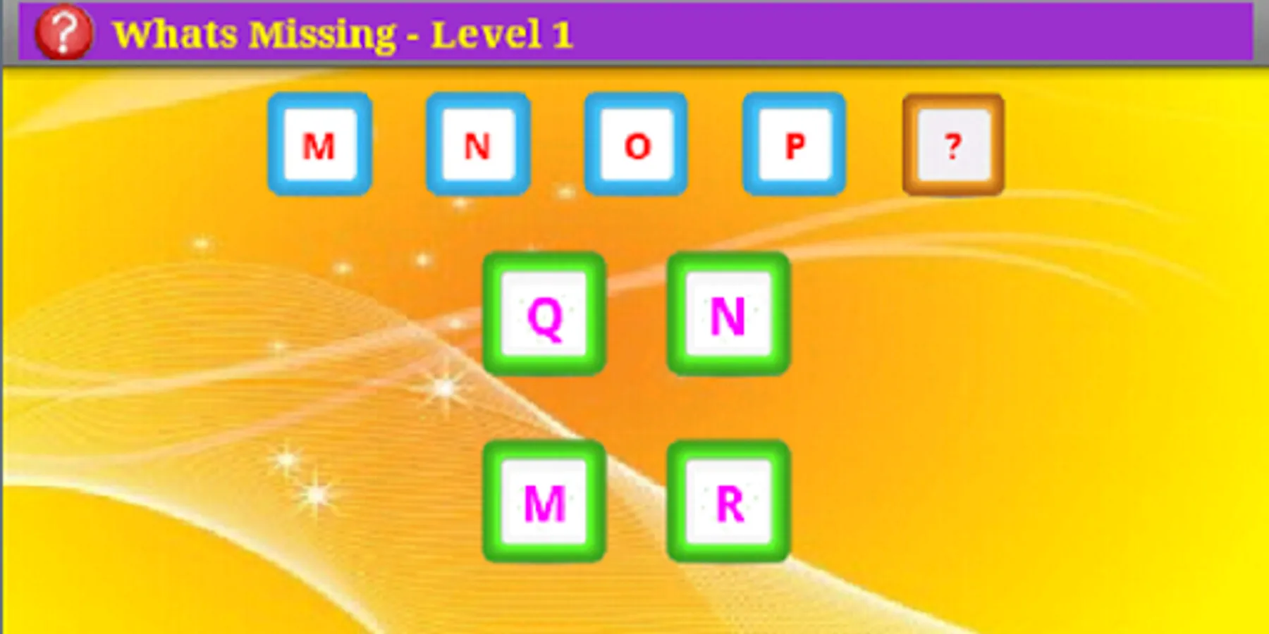 What's Missing provides a simple and fun way of learning number and alphabet sequencing. The player moves to next level by completing minimum number of correct games. After each game the player is shown the statistics of the level like the number of wins and winning percentage. This encourages the player to keep going for higher achievements.